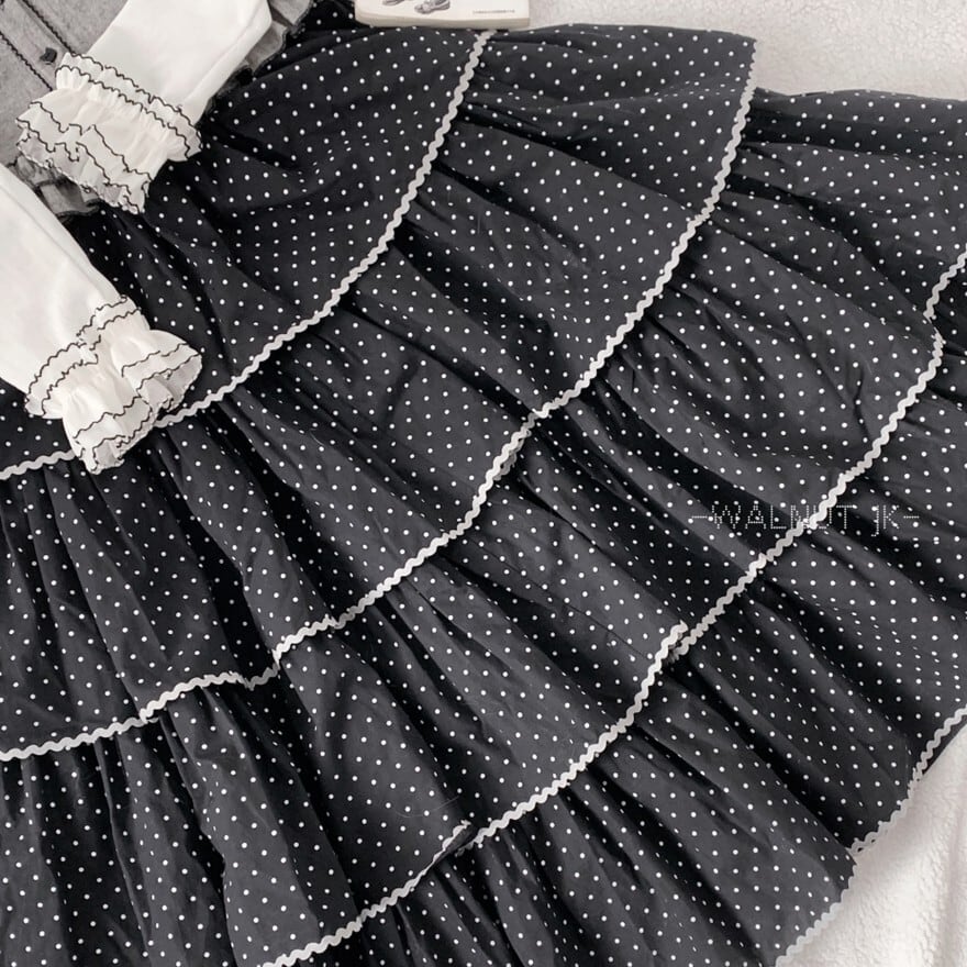 ブラックの生地に、オフホワイトのドット柄とフリル状のレースが段々に重ねられた、クラシカルロリータのスカートです。