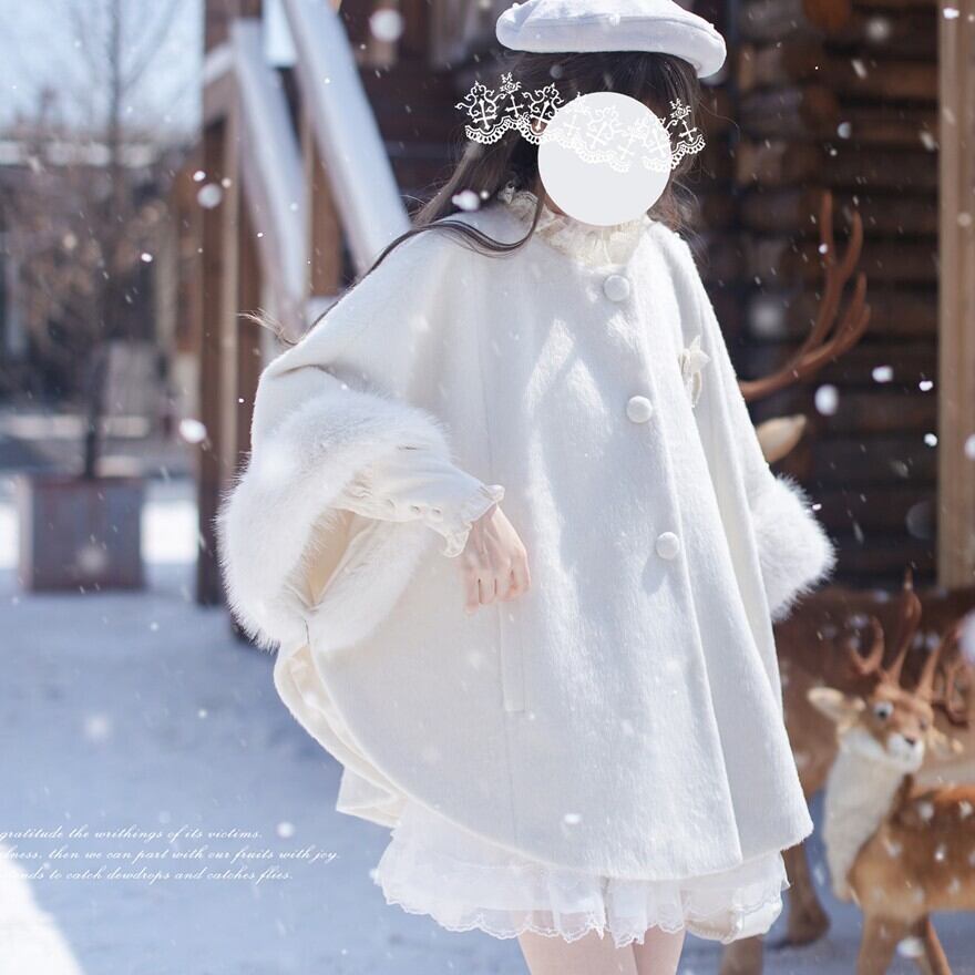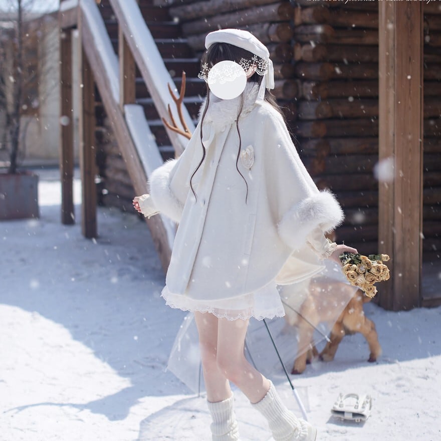 Alice style ロリィタ ケープ マント 冬 コート 防寒 ファー付き ホワイト 白 ポンチョ クラロリ 甘ロリ 厚手 アウターフェイクファー