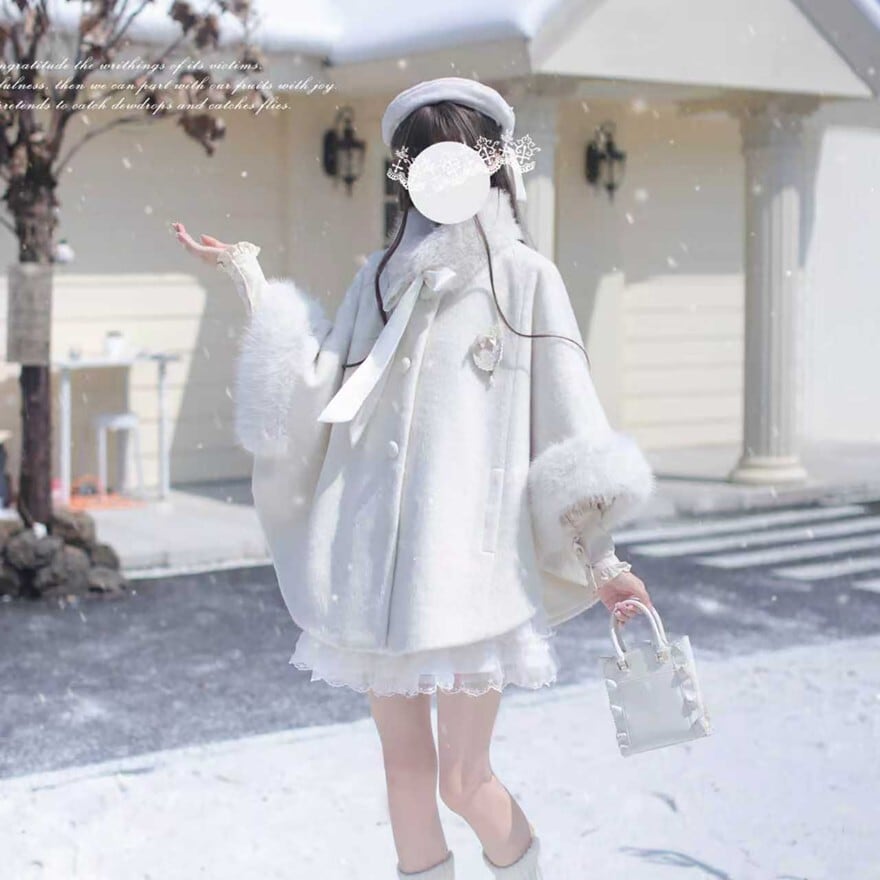 冬のロリィタコーデを格上げする、ファー付きホワイトケープマント。厚手の素材と袖口のボリュームファーで防寒性も抜群です。広がるAラインシルエットは、パニエで膨らんだスカートを美しく包み込みます。クラロリから甘ロリまで、冬の外出を彩る主役級アウターです。