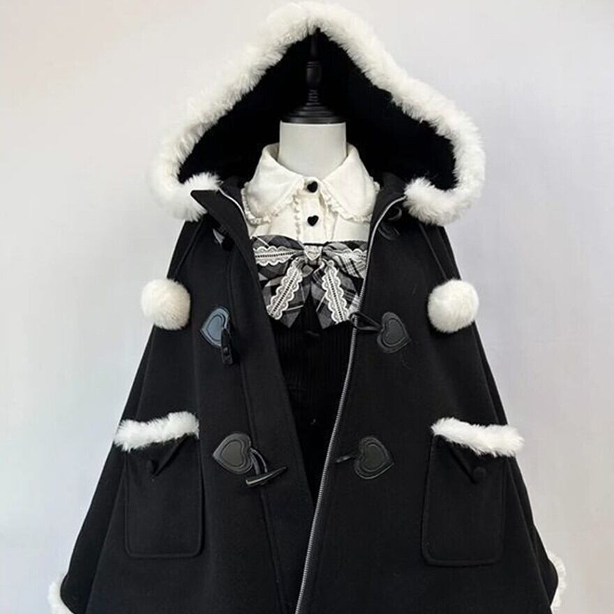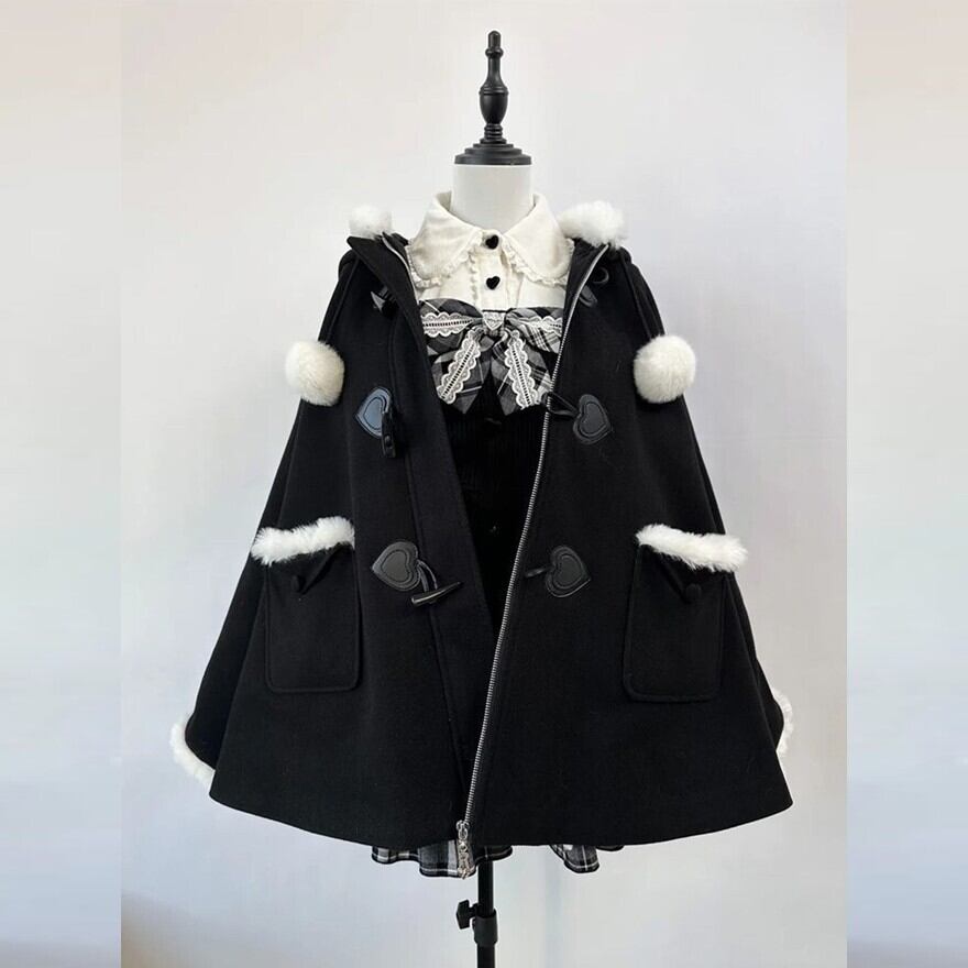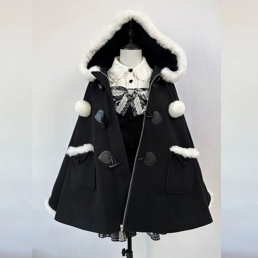 大きなファー付フードとハートの留め具が愛らしい新作ケープ。ゆったりした袖周りでパニエ入りのドレスや厚手ブラウスも着膨れせず、冬のイベントやお茶会に最適です。地雷系コーデにはもちろん、甘めロリィタのスパイスとしても主役級の可愛さを放ちます。