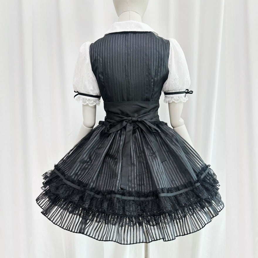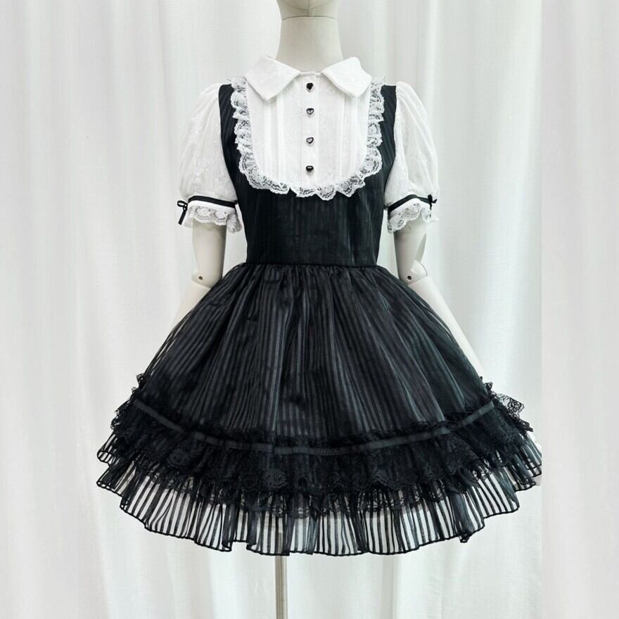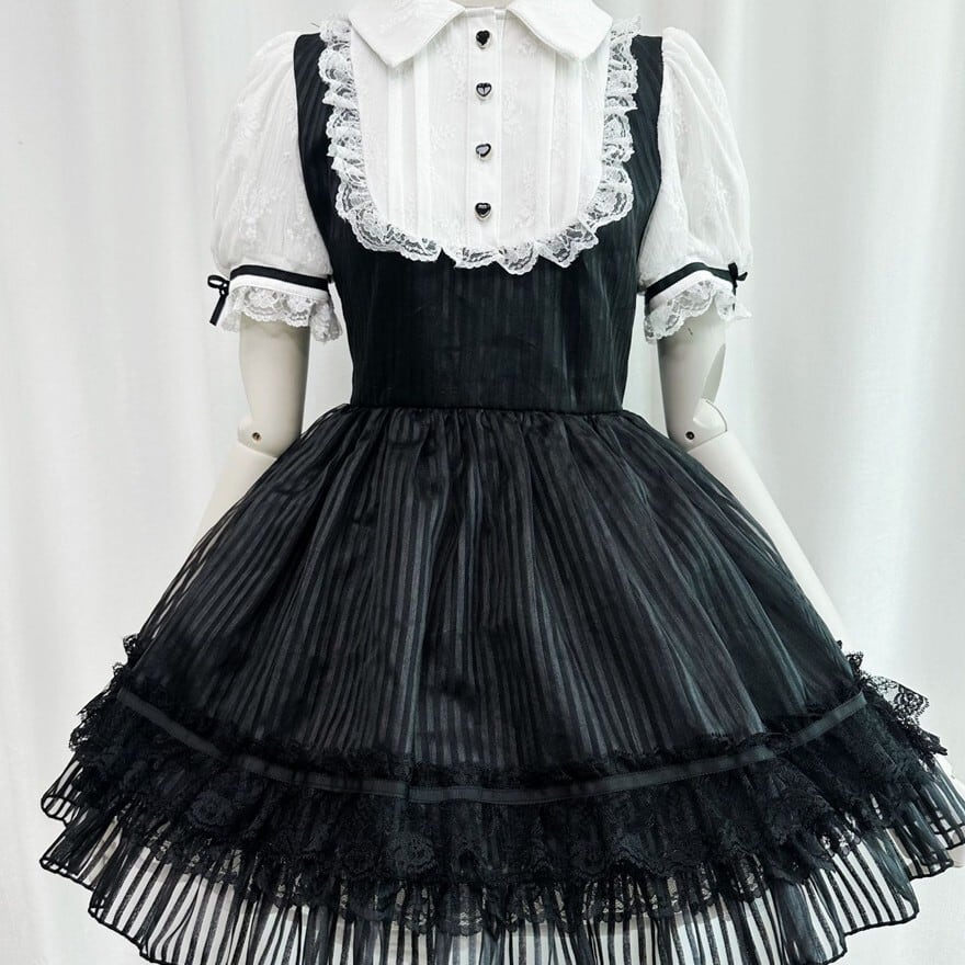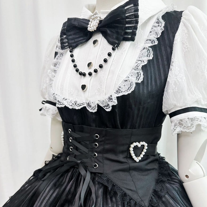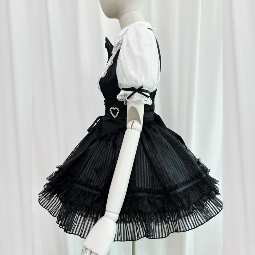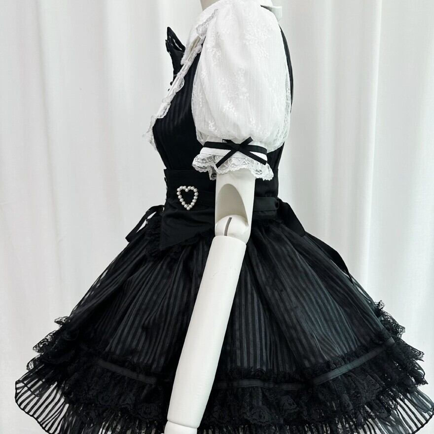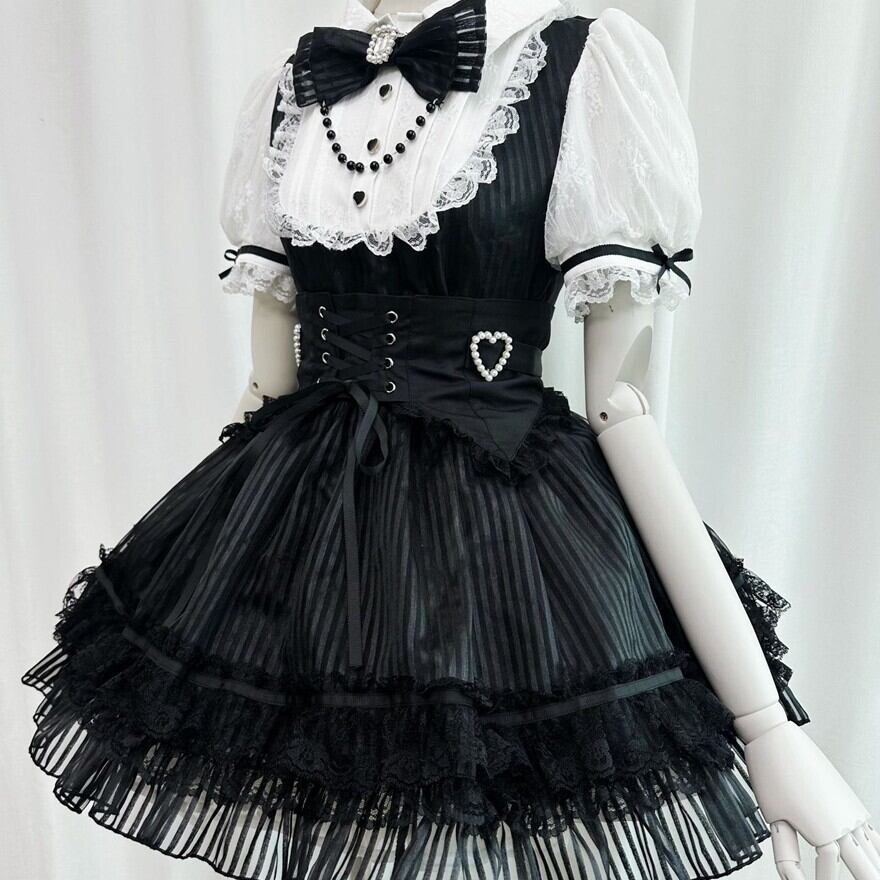 透け感のあるシフォン裾と重厚なレースが織りなす、洗練されたゴシックロリィタ。ウエストの編み上げとパールの装飾が、ドールのような美しいシルエットを叶えます。お茶会や特別な日の装いに、凛とした甘さを添える一着です。