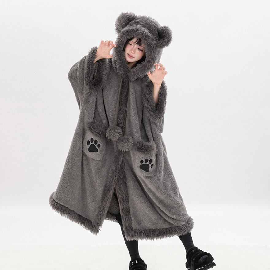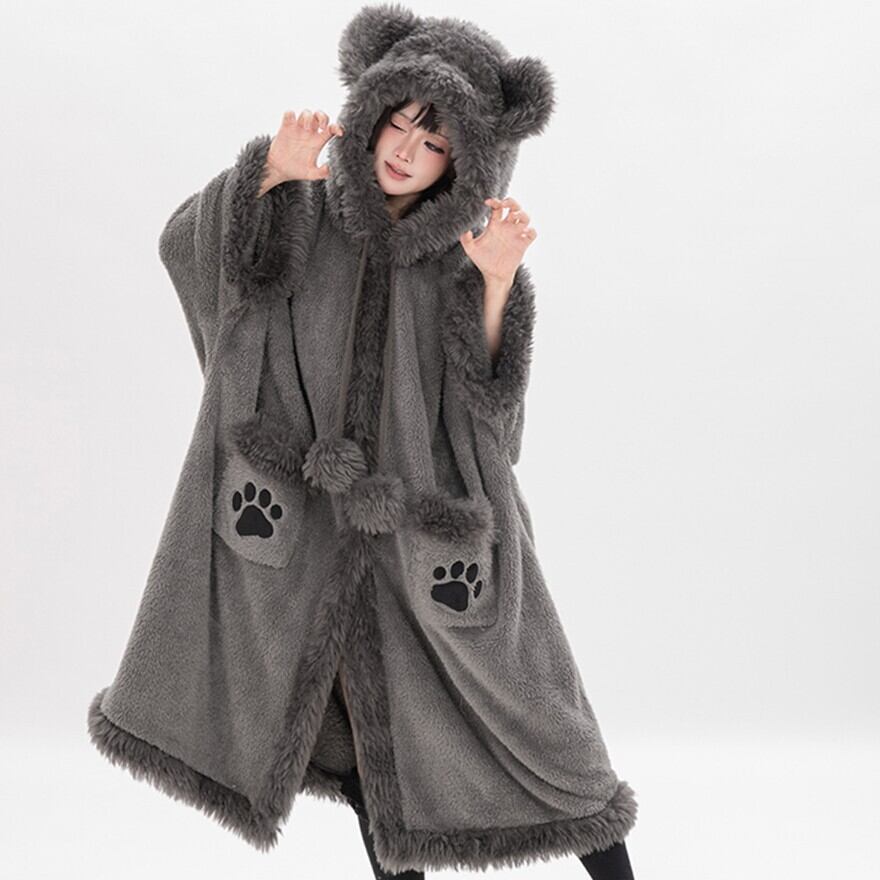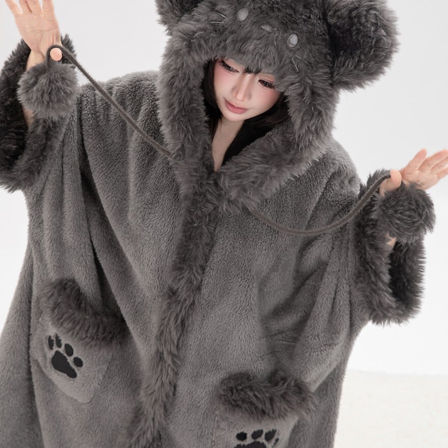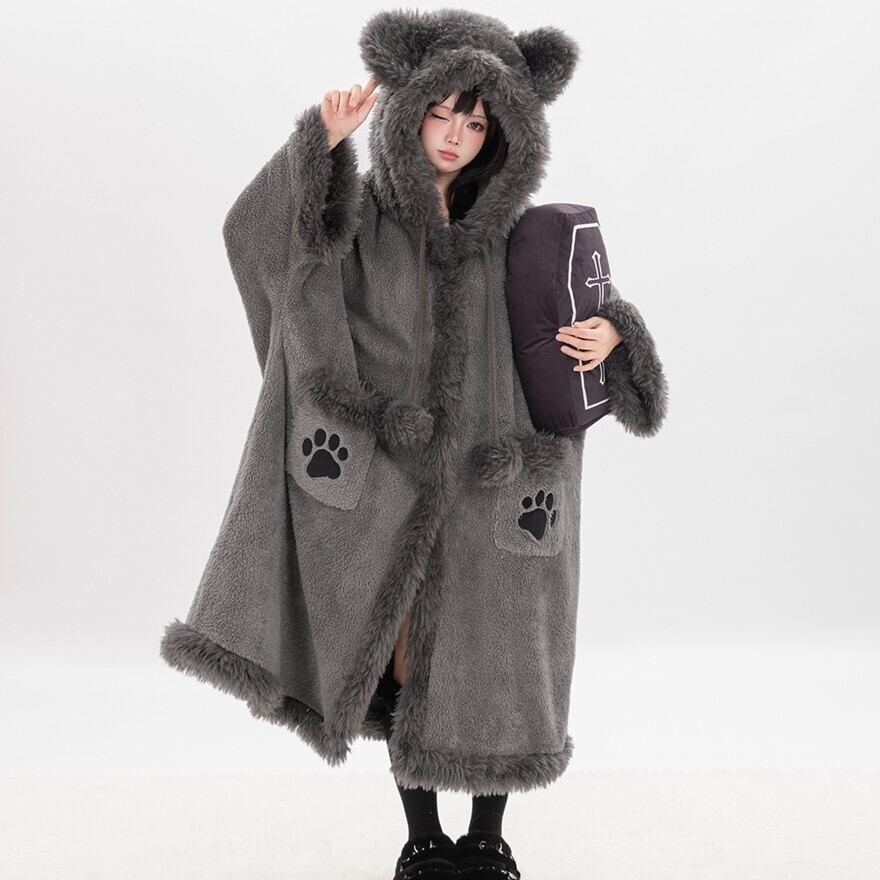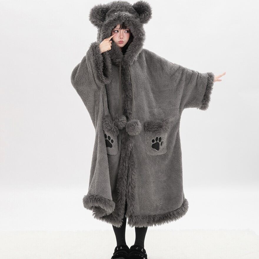 肉球ポケットに釘付け くま耳フードのふわもこボア・ロングコート(ダークグレー)