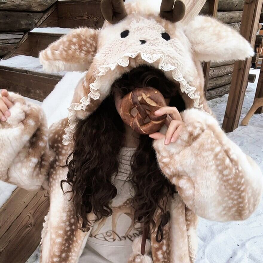 ・360度あざといバックショット: フード部分にデザインされたつぶらな瞳のバンビフェイスと小さなツノが、歩くたびに揺れて視線を釘付けにします。