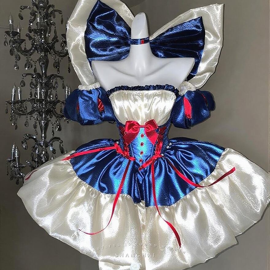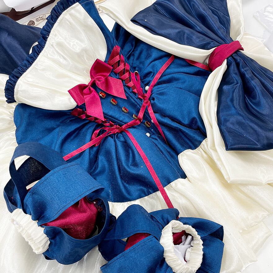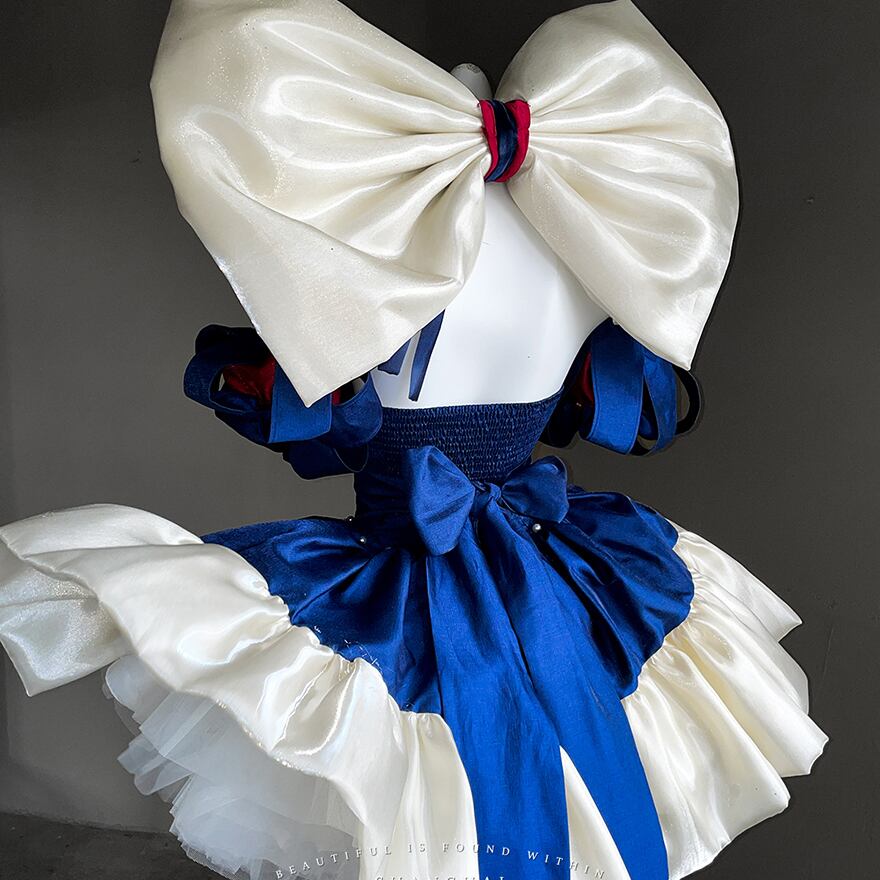白雪姫モチーフ ロリィタドレス 甘ロリ フィッシュテール パーティードレス 豪華ビッグリボン 紺×白 お茶会・撮影会