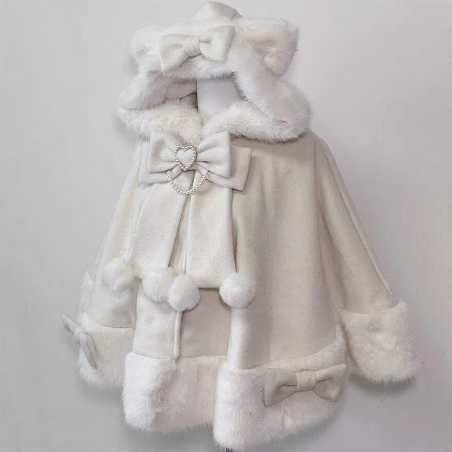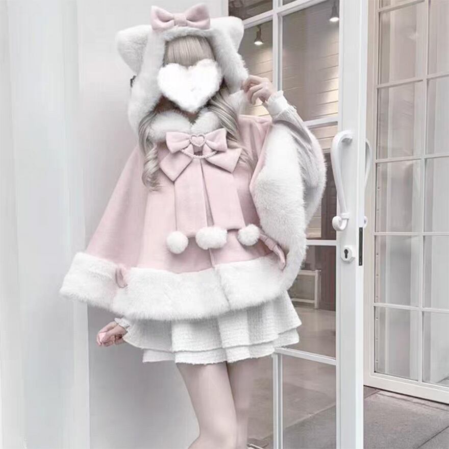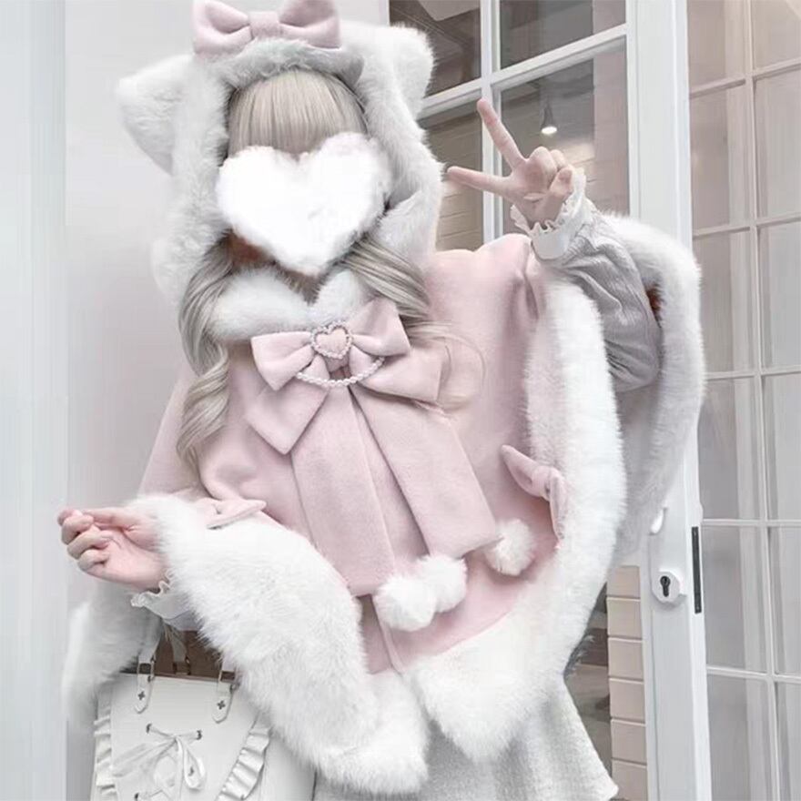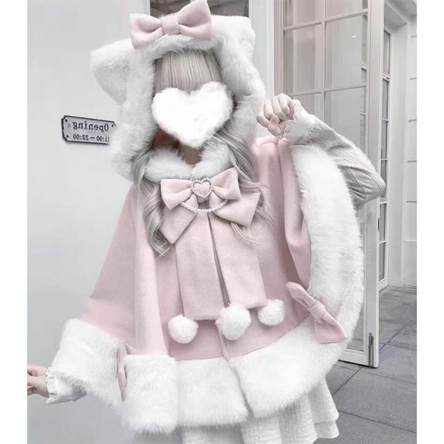 【甘ロリ】猫耳フード ファー ケープ マント | ゆめかわいい ハート ビジュー リボン ポンチョ コート ロリィタ 防寒 冬物 白 ピンク