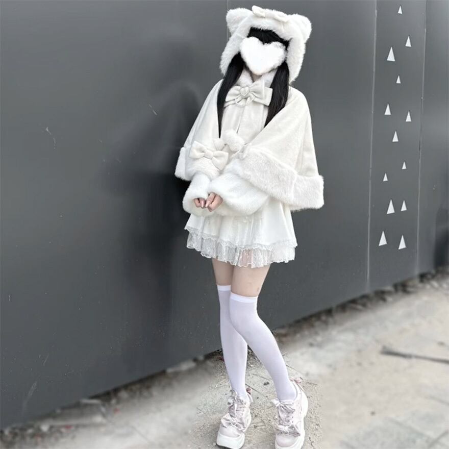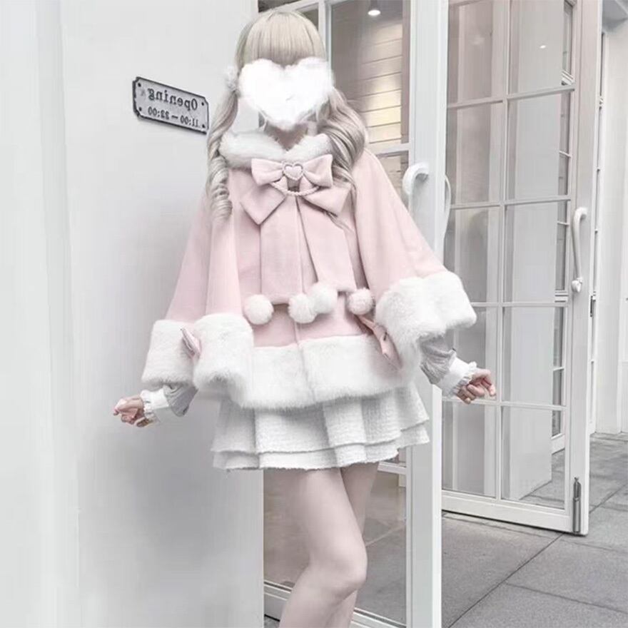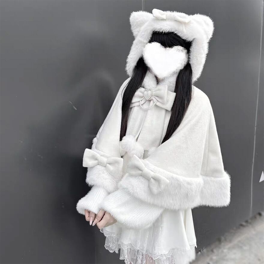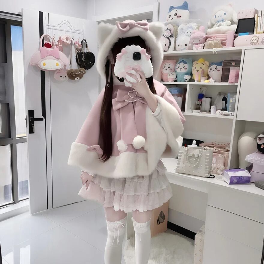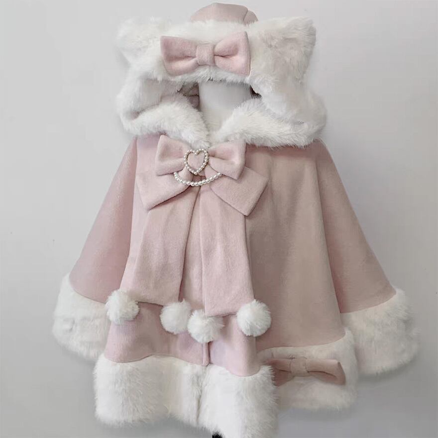 【甘ロリ】猫耳フード ファー ケープ マント | ゆめかわいい ハート ビジュー リボン ポンチョ コート ロリィタ 防寒 冬物 白 ピンク