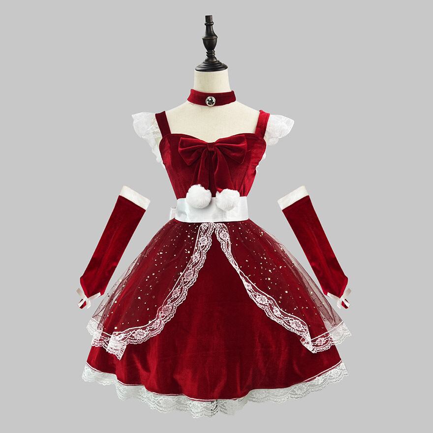 高級感溢れる赤のベルベットに、星が煌めくチュールを重ねたサンタ風セットアップです。胸元の大きなリボンと真っ白なポンポンが愛らしさを引き立て、取り外し可能なアームカバーが冬の装いを格上げ。特別な夜を彩る、主役級のドーリースタイルを叶えます。
