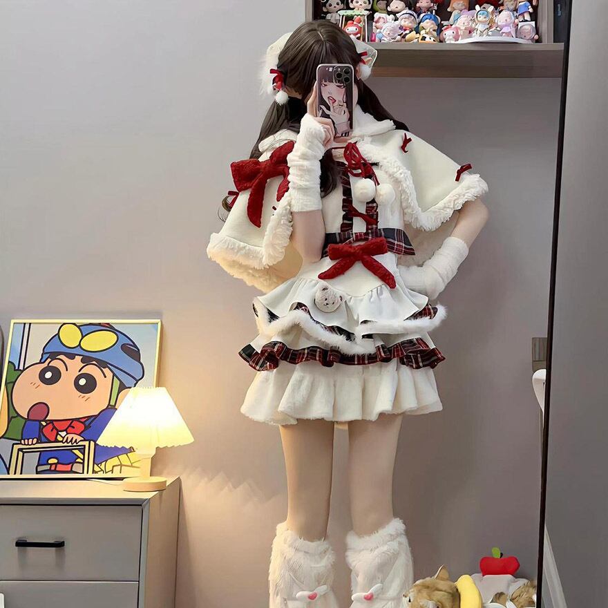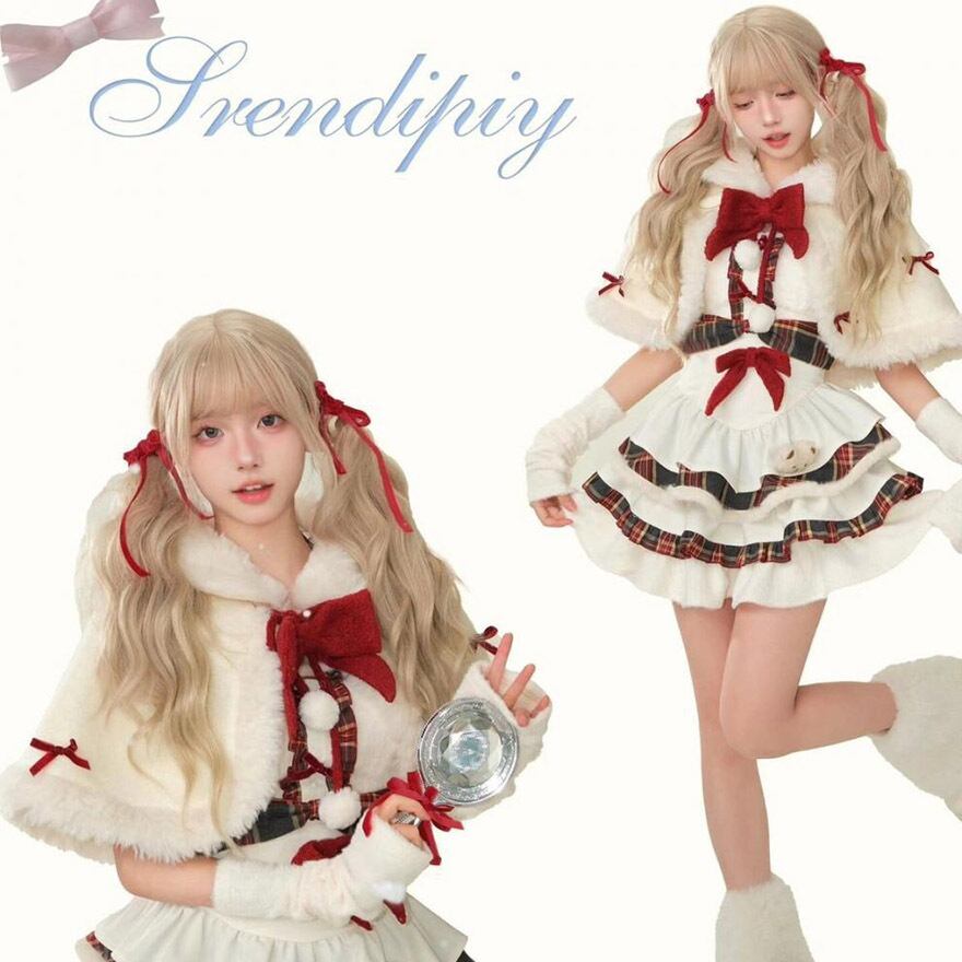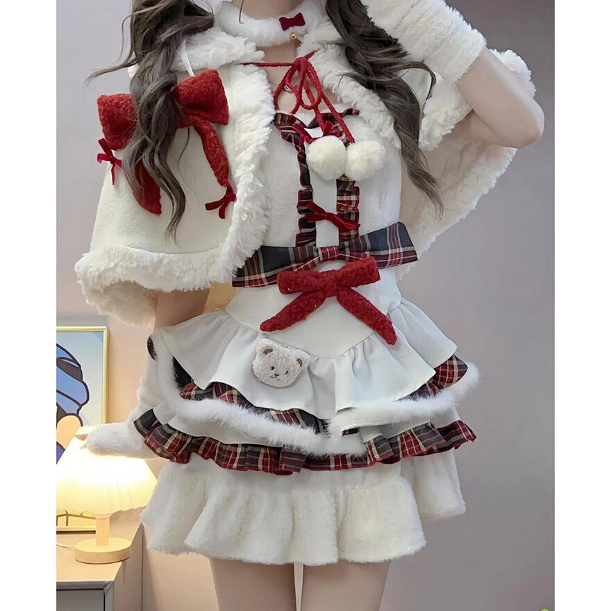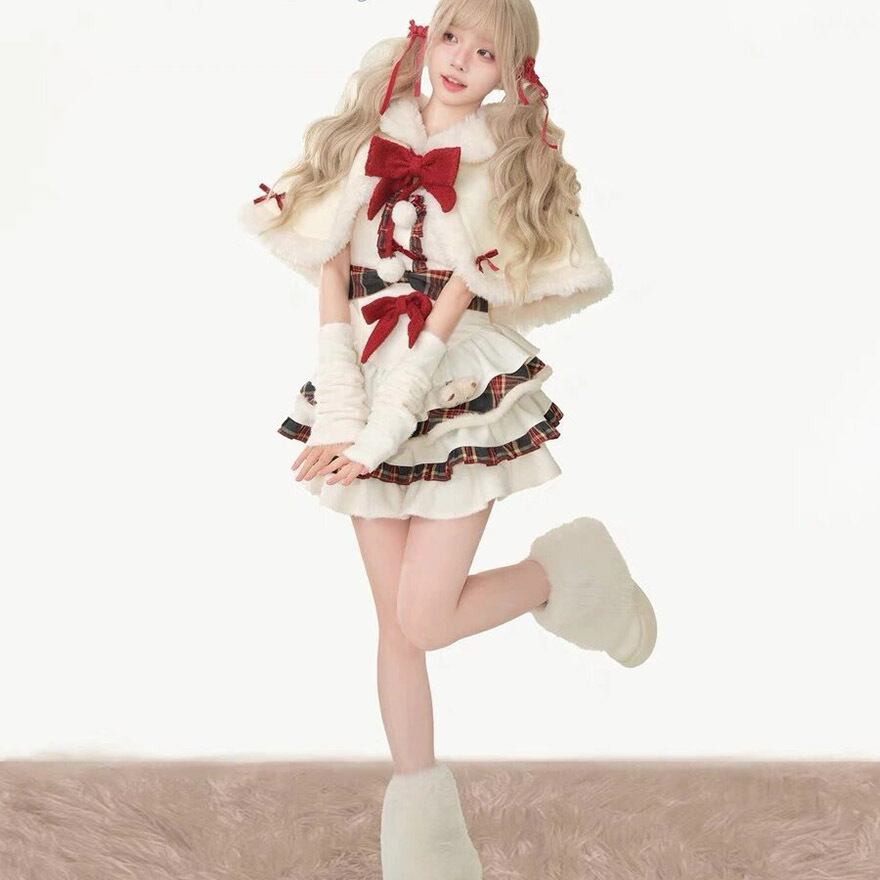 ケープとチェック柄スカートがセットになった、冬の主役級セットアップです。多段フリルに重なる赤のチェックが愛らしく、胸元の大きなリボンがアクセント。