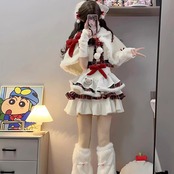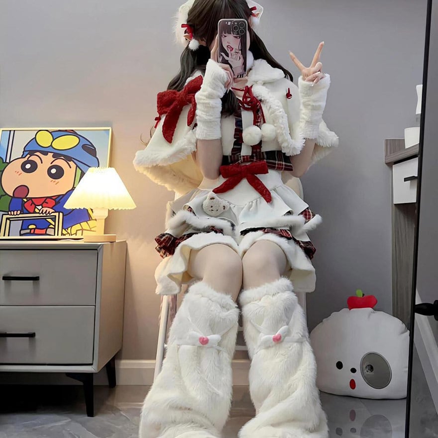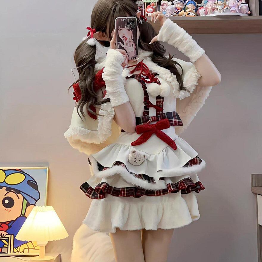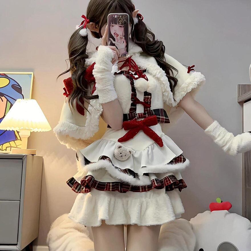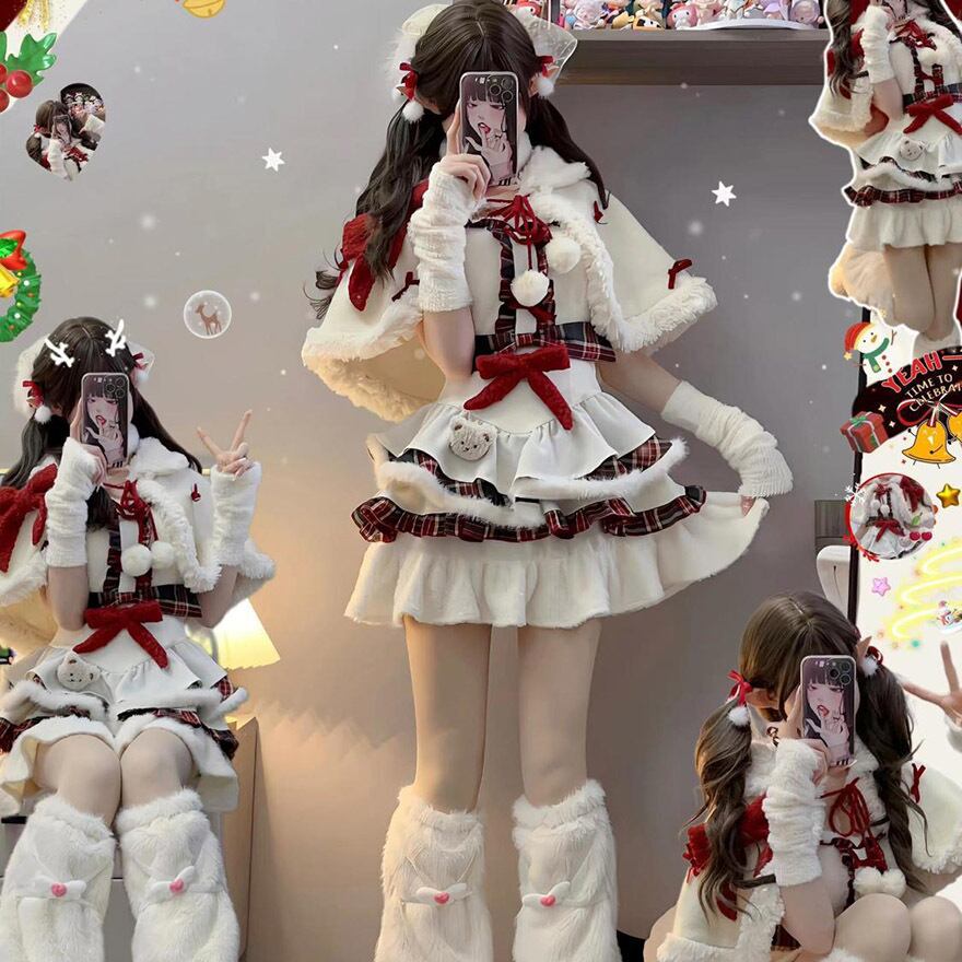 ケープとチェック柄スカートがセットになった、冬の主役級セットアップです。多段フリルに重なる赤のチェックが愛らしく、胸元の大きなリボンがアクセント。