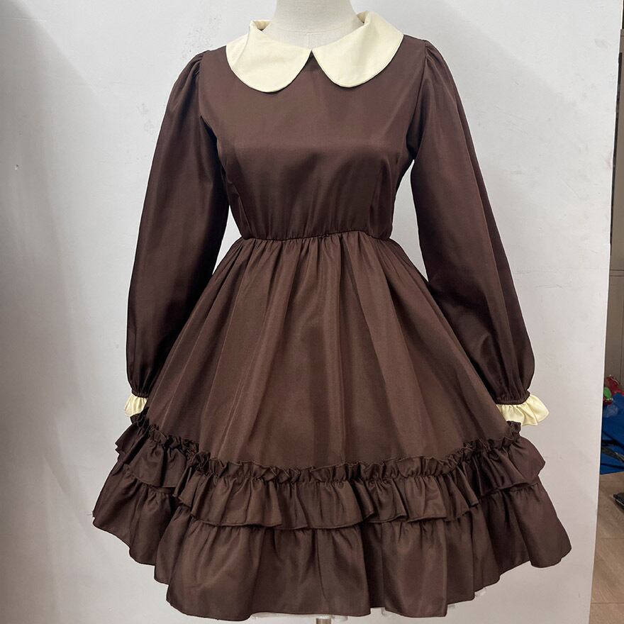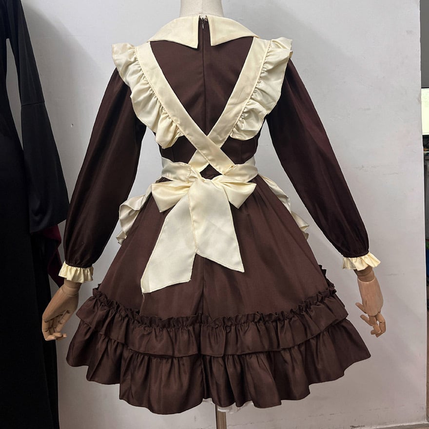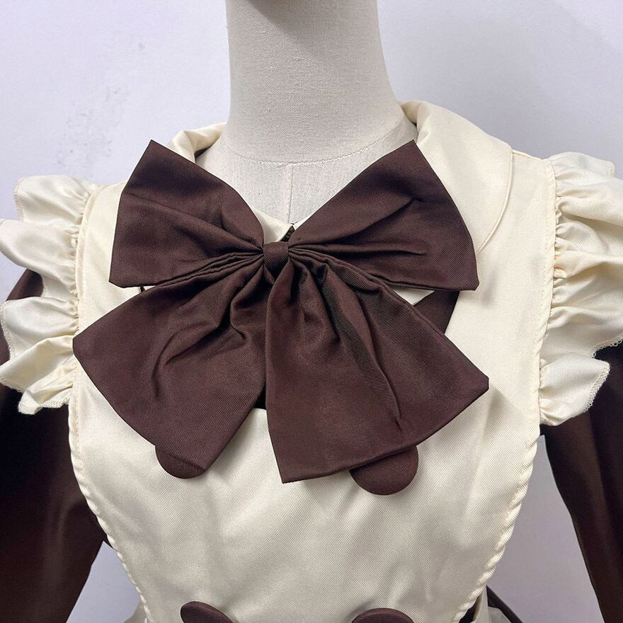 深みのあるブラウンにアイボリーのエプロンが映える、メイド風クラシカルセットアップです。大きな胸元リボンと背中の編み上げが、清楚ながらも愛らしいシルエットを演出。お屋敷のお嬢様のような、上品で甘いひとときを叶える特別な一着です。