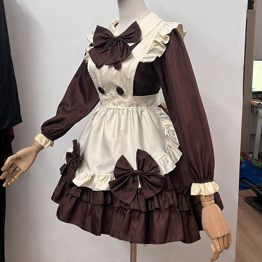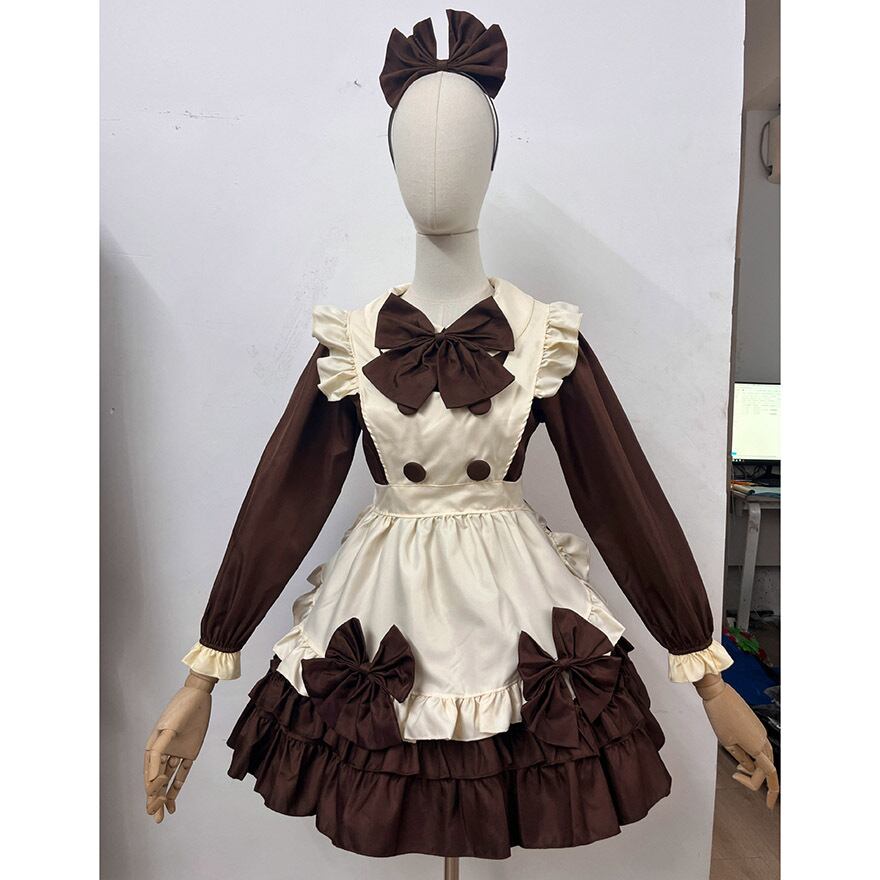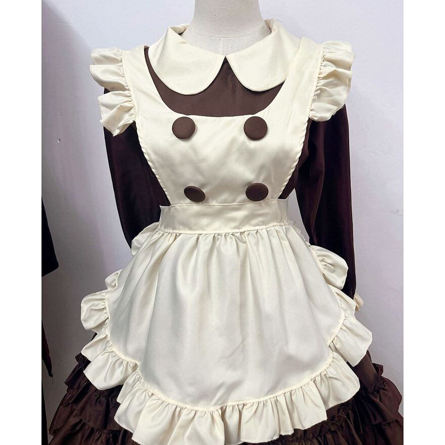 メイド コスチューム ティータイム メイド風 セットアップ ドレス | クラシック ロリィタ エプロン リボン 清楚 お嬢様 茶色 ガーリー コンカフェ