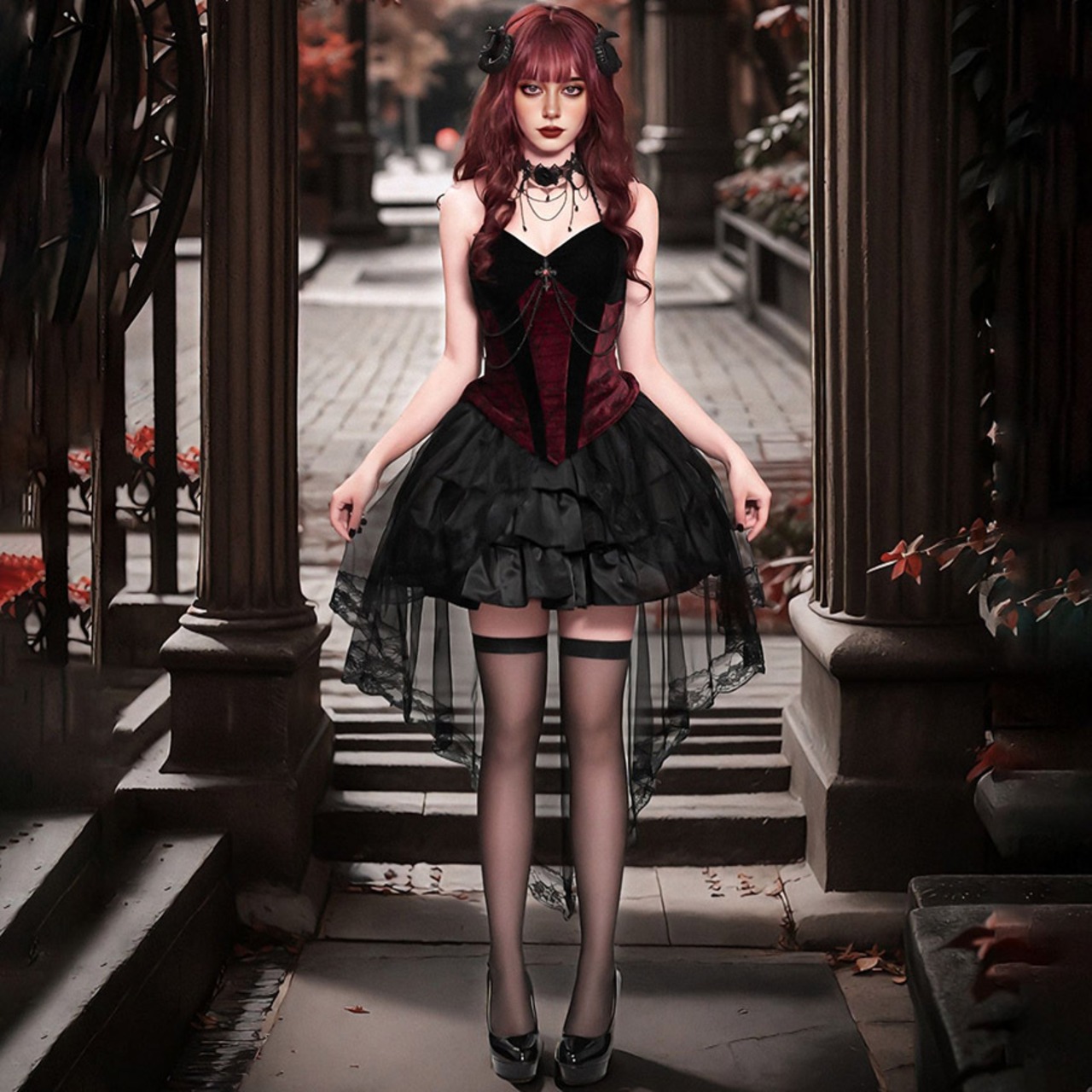 【ゴスロリ】 ベロア コルセット フィッシュテール ドレス | ゴシック ロリィタ 燕尾 チュール 華麗 闇可愛い パーティ 衣装 赤 黒