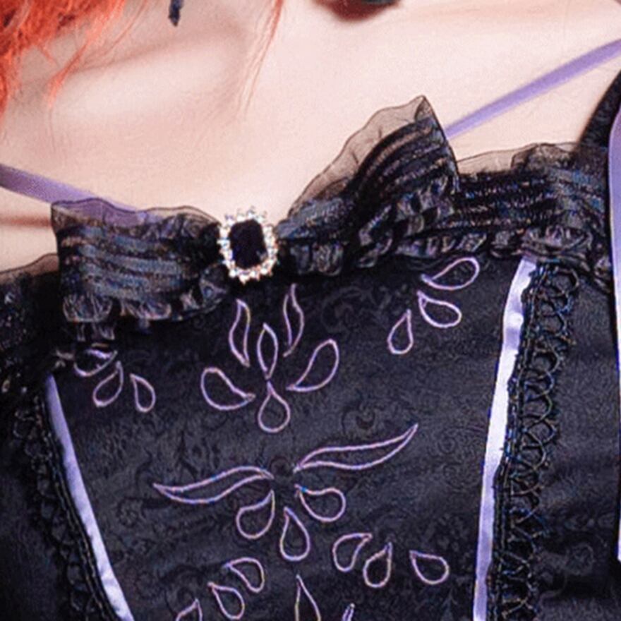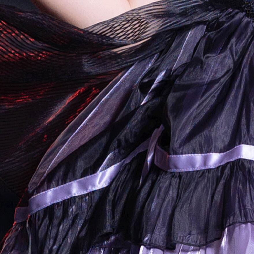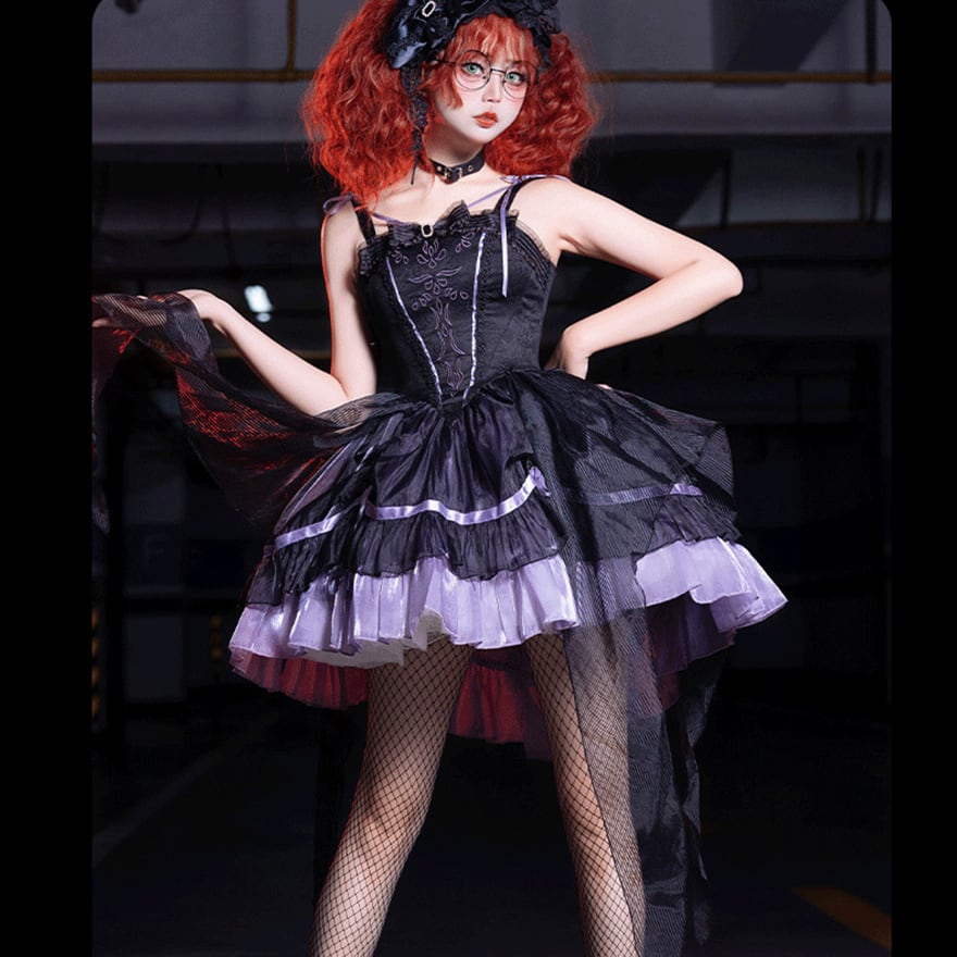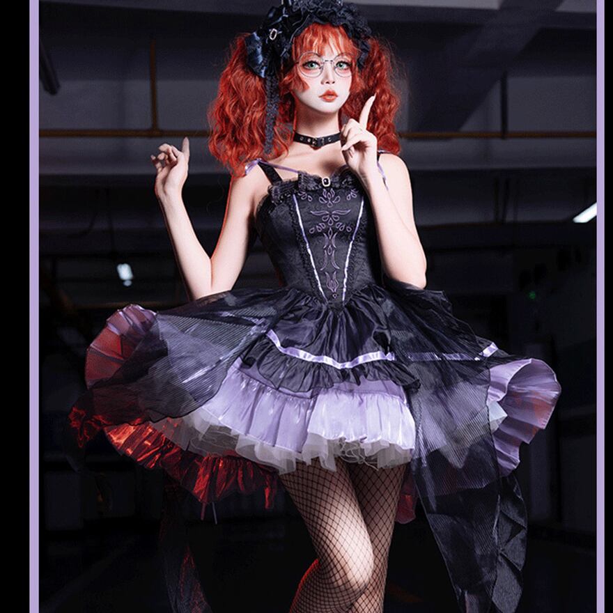 艶やかなサテン地と幾重にも重なるティアードフリルが圧倒的な存在感を放つ、王道ゴスロリドレスです。ウエストのコルセットデザインが美しい曲線を強調し、ボリュームたっぷりの姫袖がお人形のようなシルエットを演出。闇の中に気品が漂う、至高の一着です。