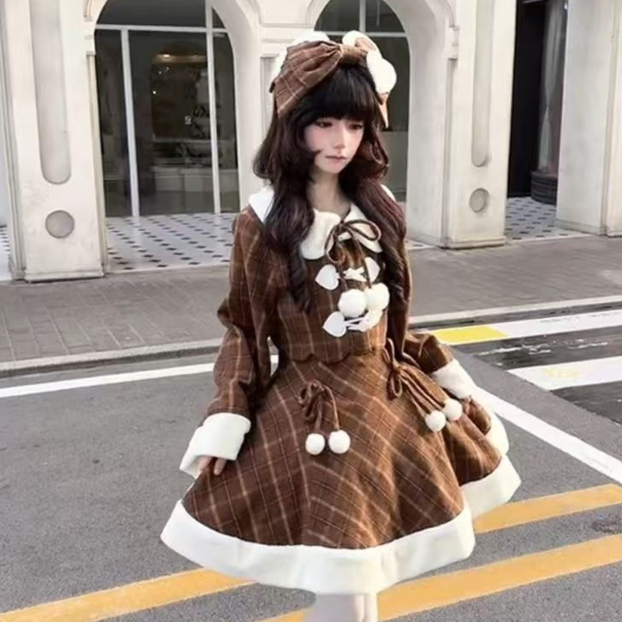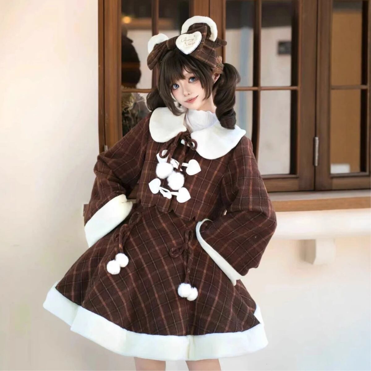 温かみのあるブラウンのチェック柄生地に、襟元や袖口、裾を飾る真っ白なボアが特徴的なジャケットとスカートのセットアップです。