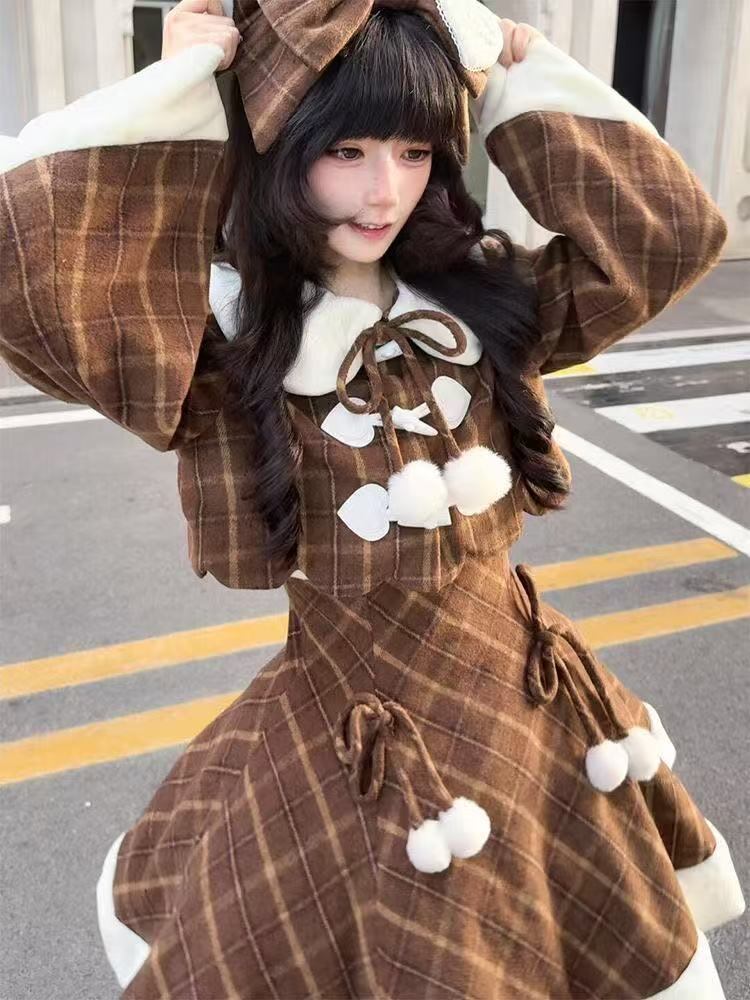 量産型ロリィタ 森ガール セットアップ チェック柄 ジャケット スカート くまちゃん 甘ロリ ゆめかわ 地雷系