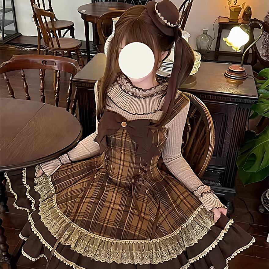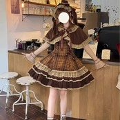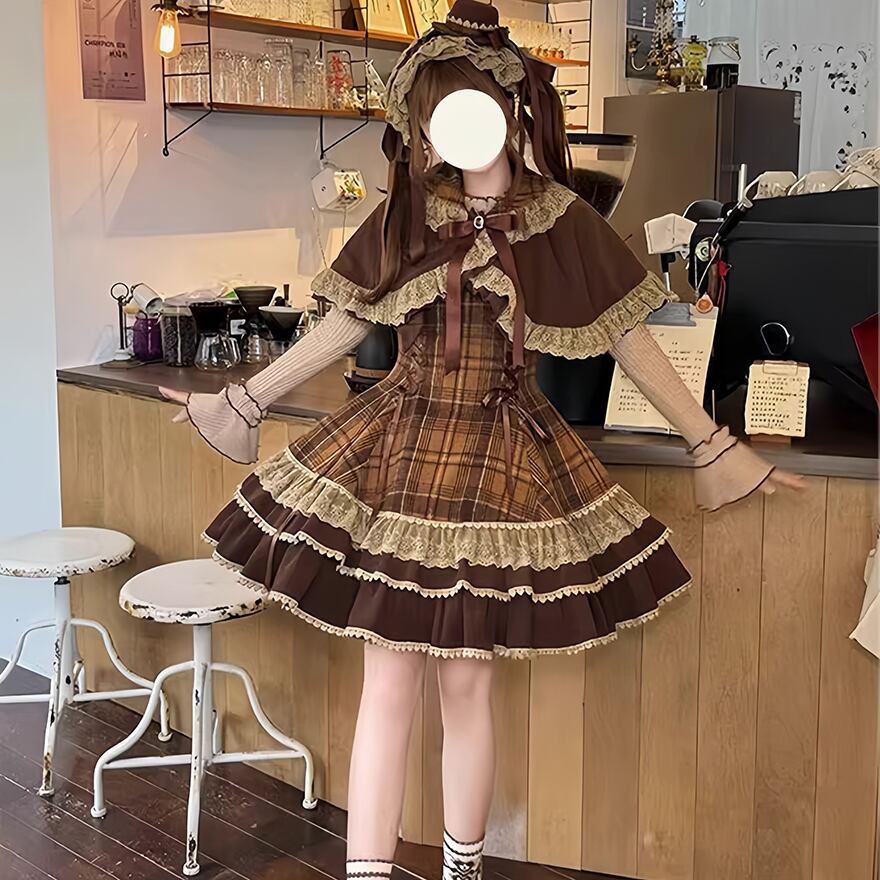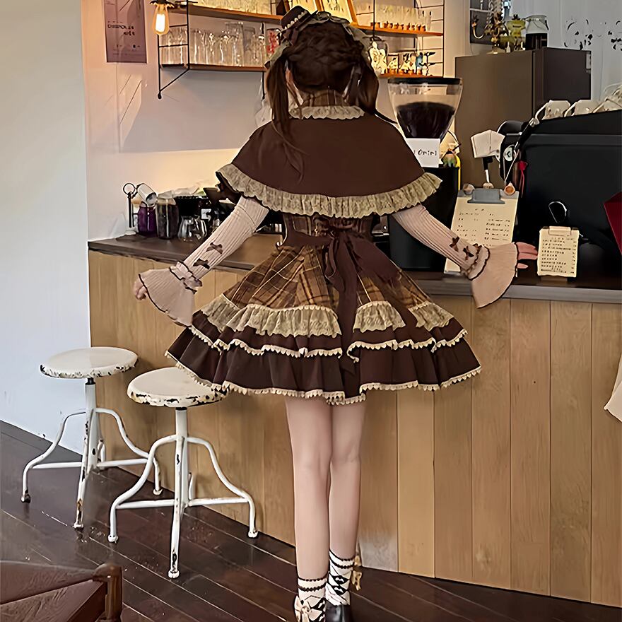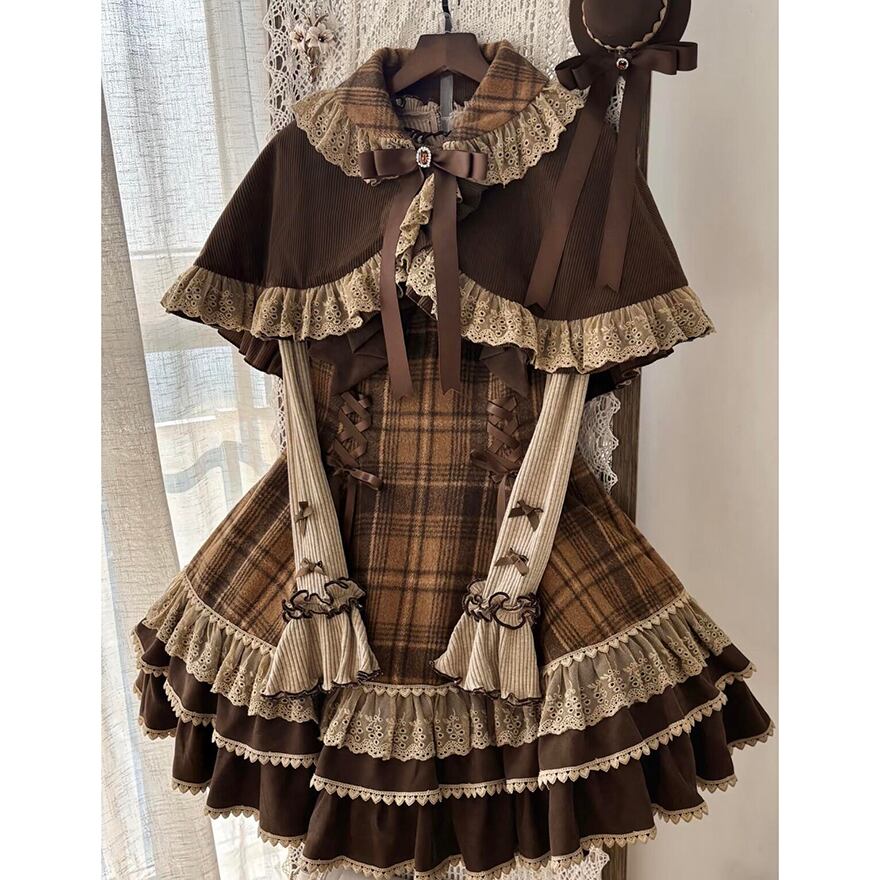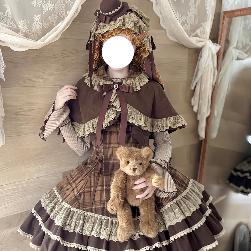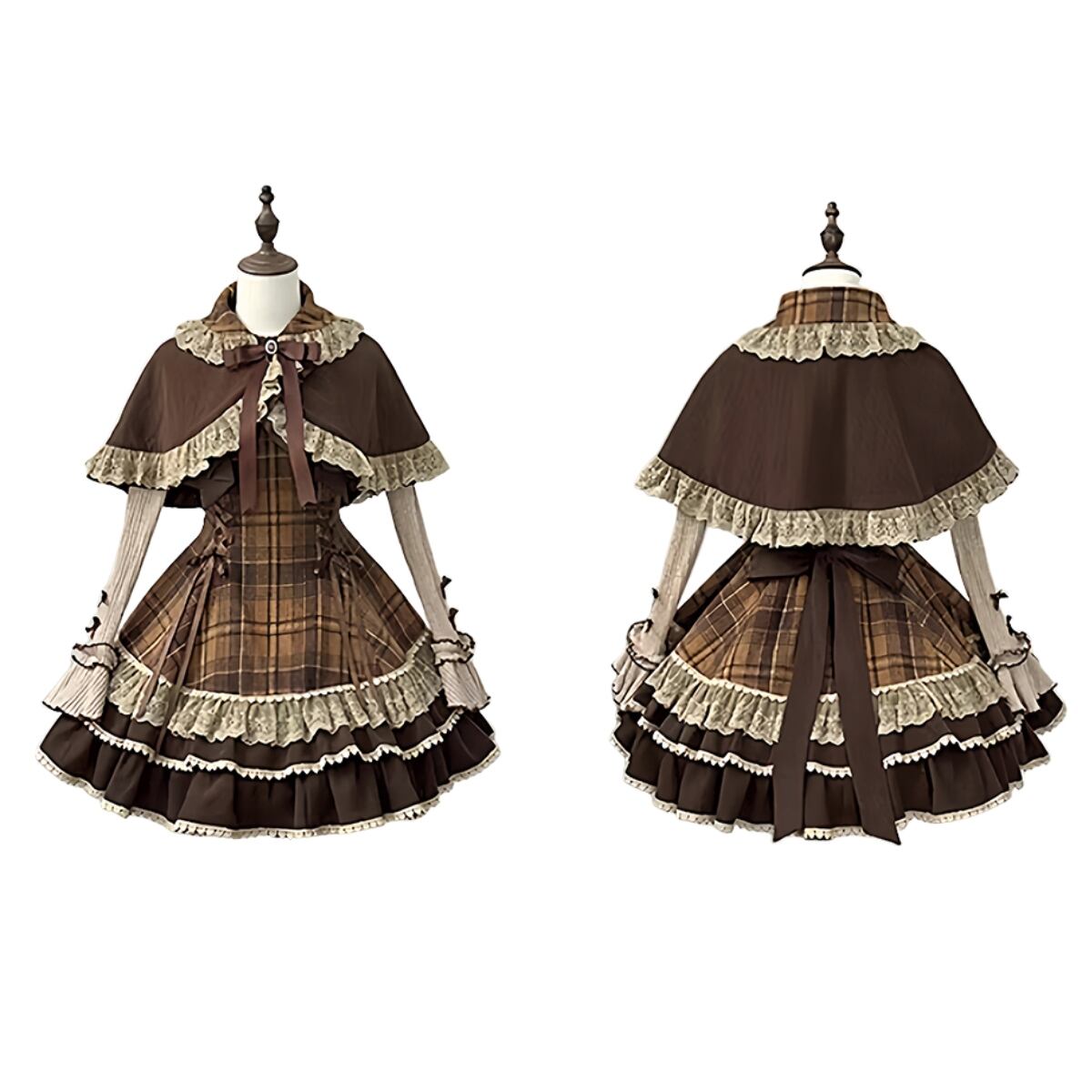 探偵を思わせるクラシカルなケープと、落ち着いたブラウンチェック柄のジャンパースカートのセットアップです。丸みのあるショート丈ケープはフロントのリボンとボタンが特徴で、取り外し可能なボウタイ付きの長袖ブラウスと合わせることで、知的で上品なロリィタスタイルを演出できます。