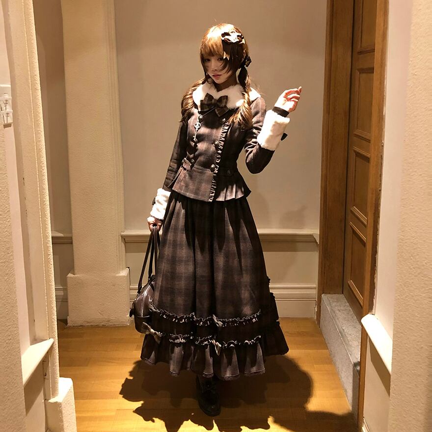 落ち着いたブラウンチェック柄が特徴で、付属のリボンタイを合わせることで、知的でクラシカルな英国風のロリータファッションを演出。