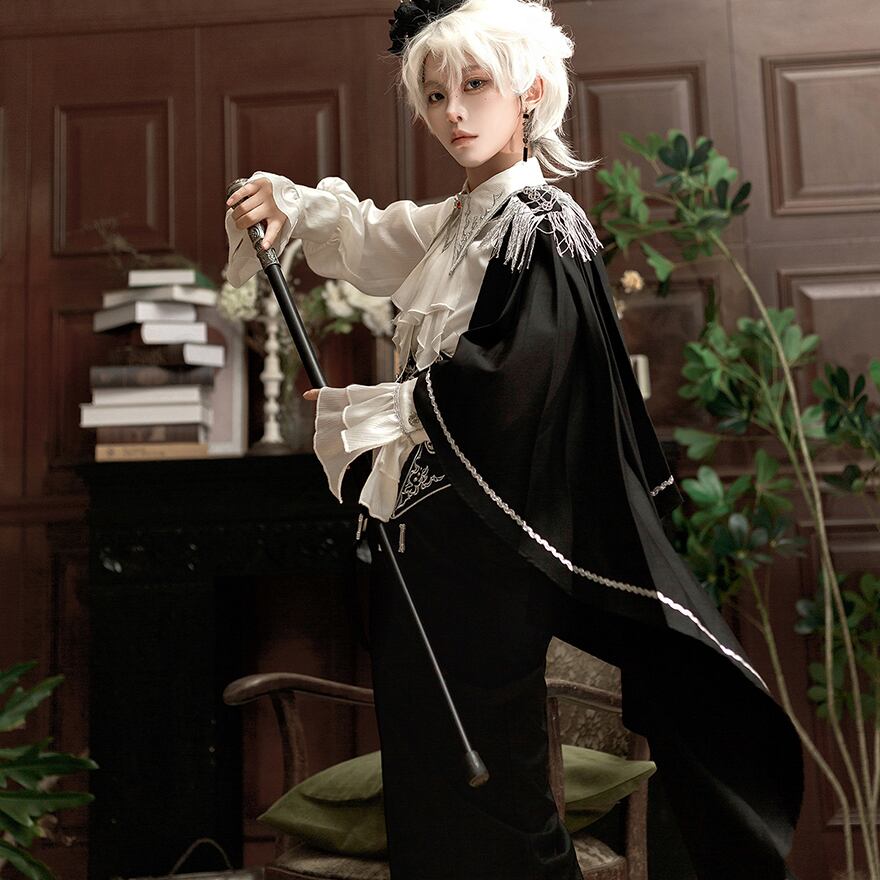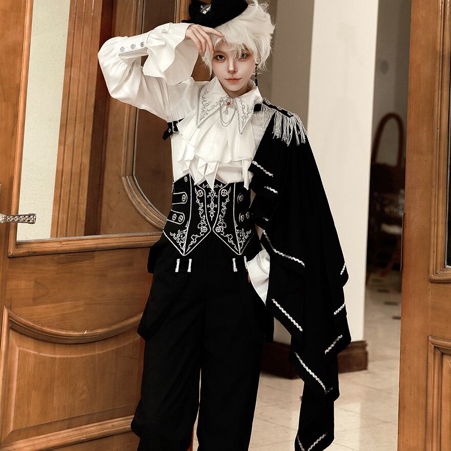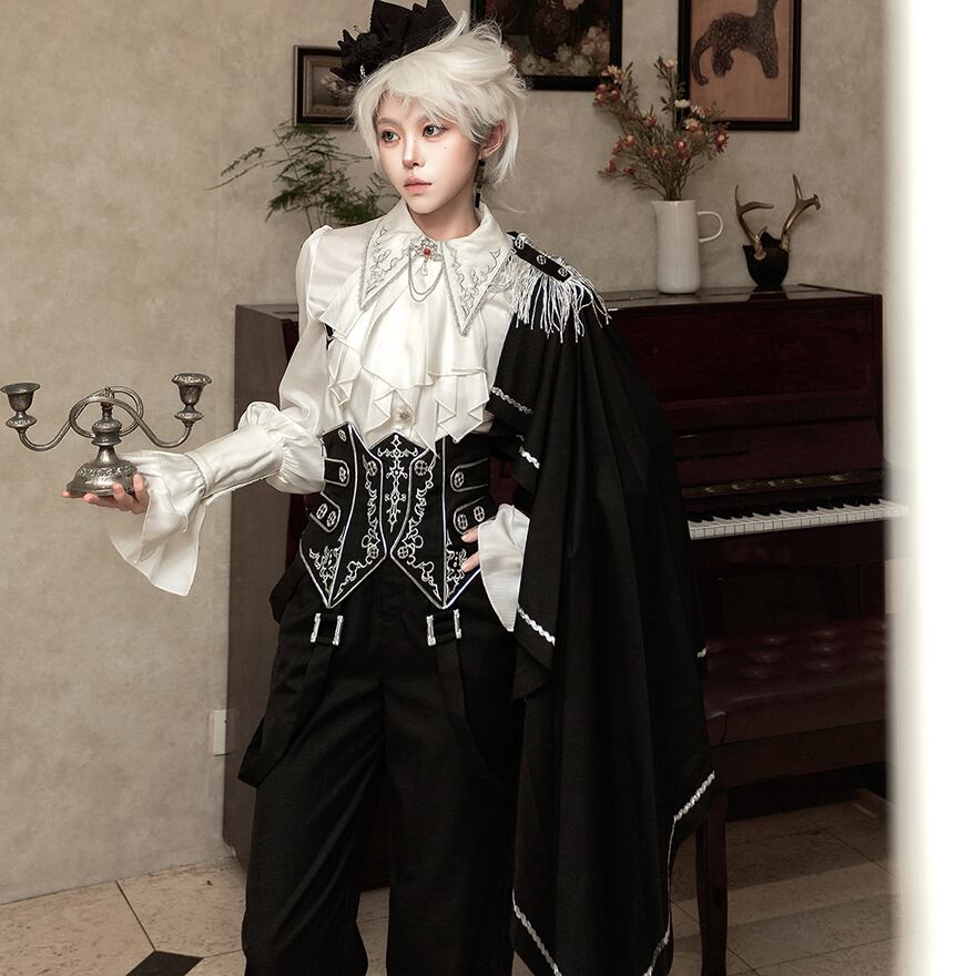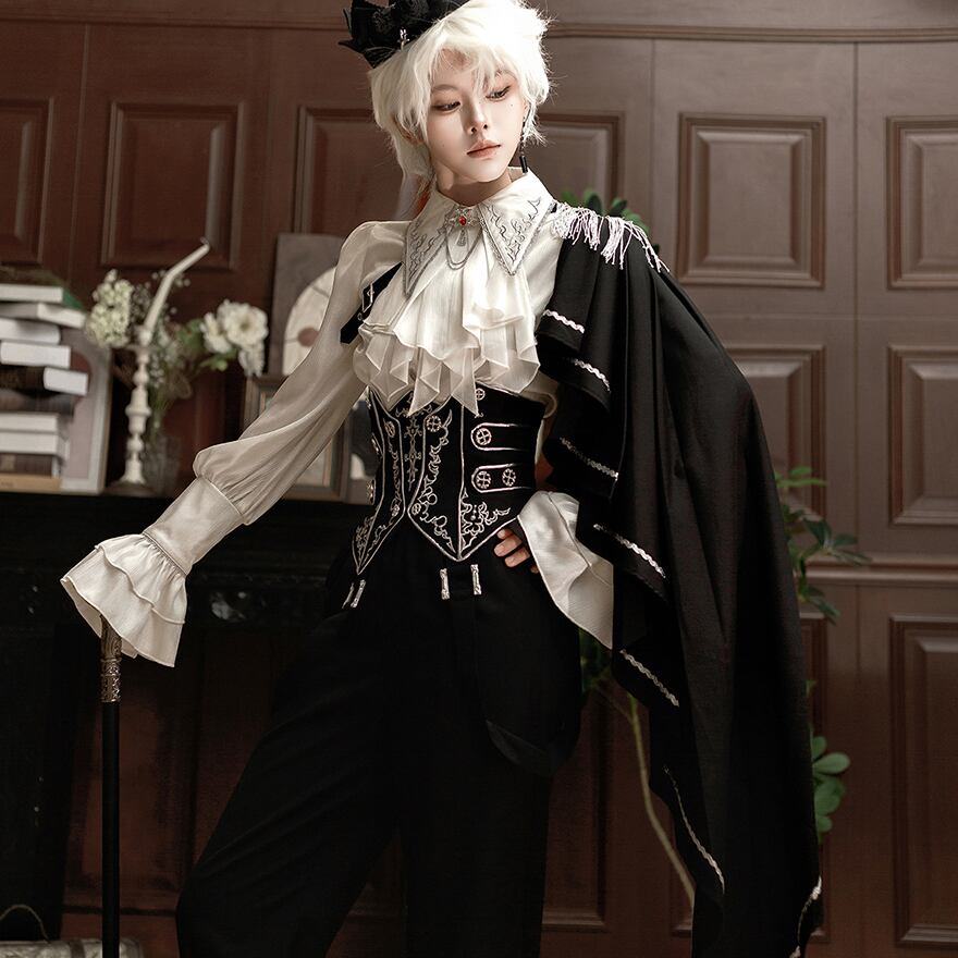 気品漂う「皇子系」スタイルを完成させる、豪華3点セットアップです。繊細な刺繍を施したコルセットがウエストラインを美しく引き締め、片側マントとフリンジが軍服のような凛々しさを演出します。フリルのブラウスと流麗なワイドパンツが、少年のような無垢さと貴族の優雅さを両立。特別な日の一着に最適です。
