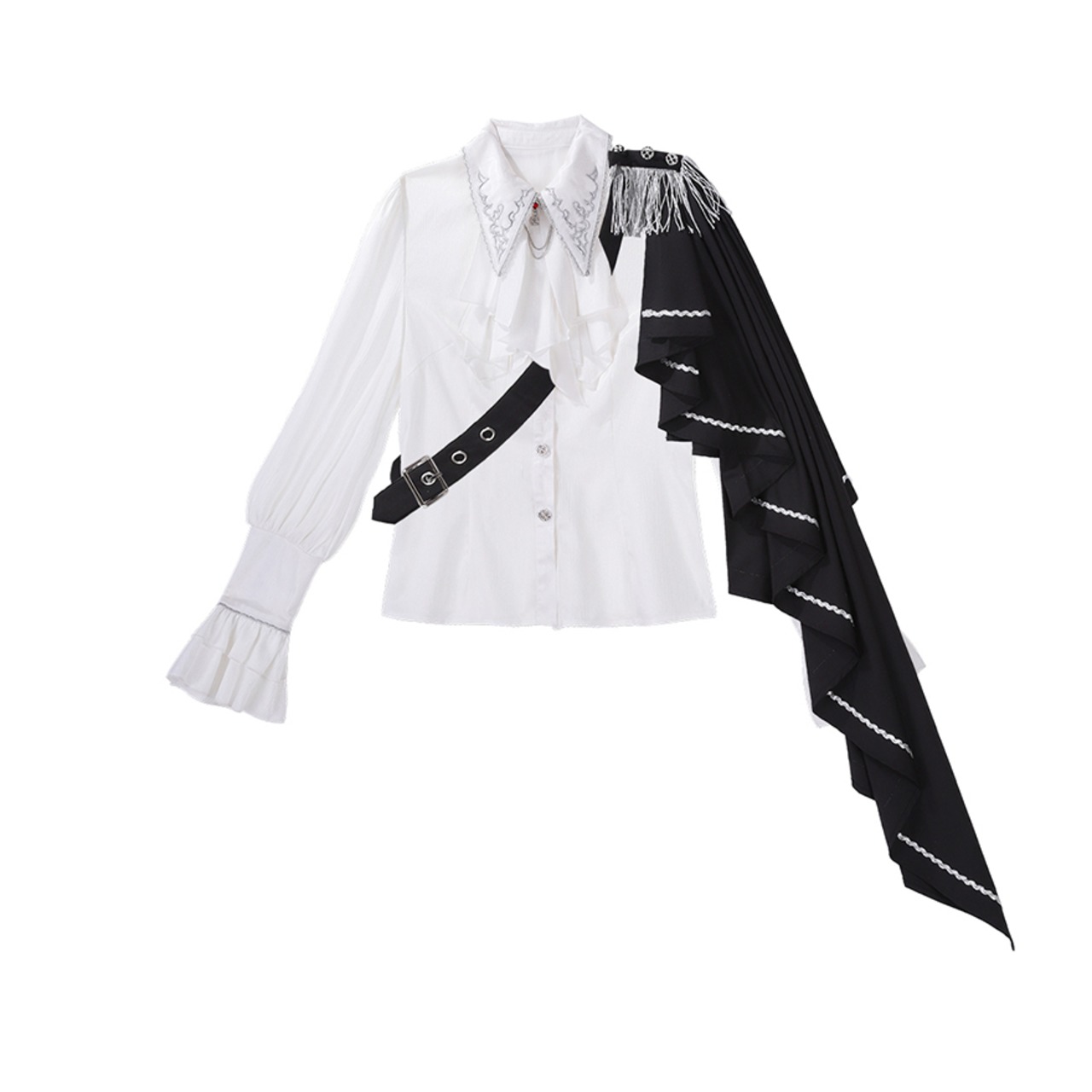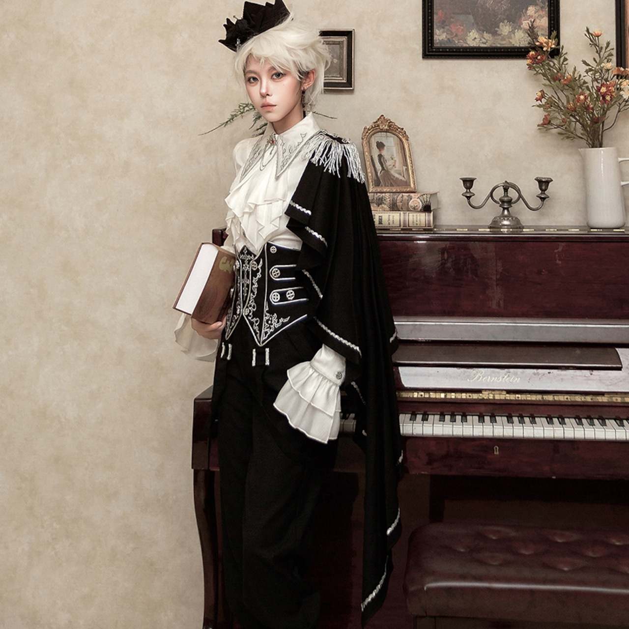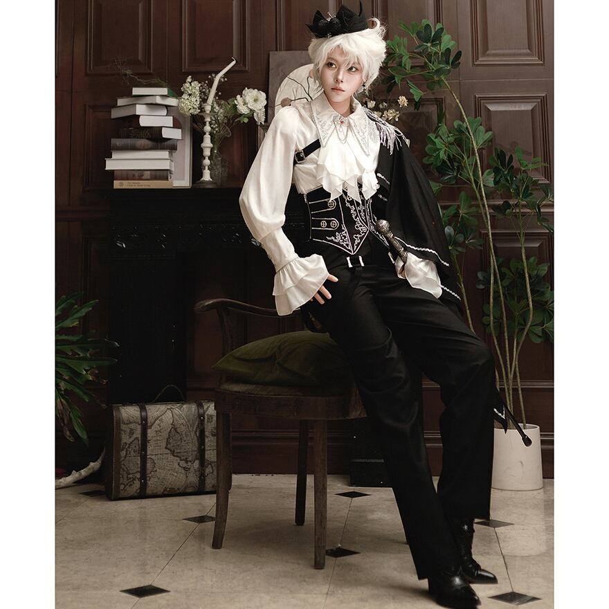 気品漂う「皇子系」スタイルを完成させる、豪華3点セットアップです。繊細な刺繍を施したコルセットがウエストラインを美しく引き締め、片側マントとフリンジが軍服のような凛々しさを演出します。フリルのブラウスと流麗なワイドパンツが、少年のような無垢さと貴族の優雅さを両立。特別な日の一着に最適です。