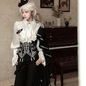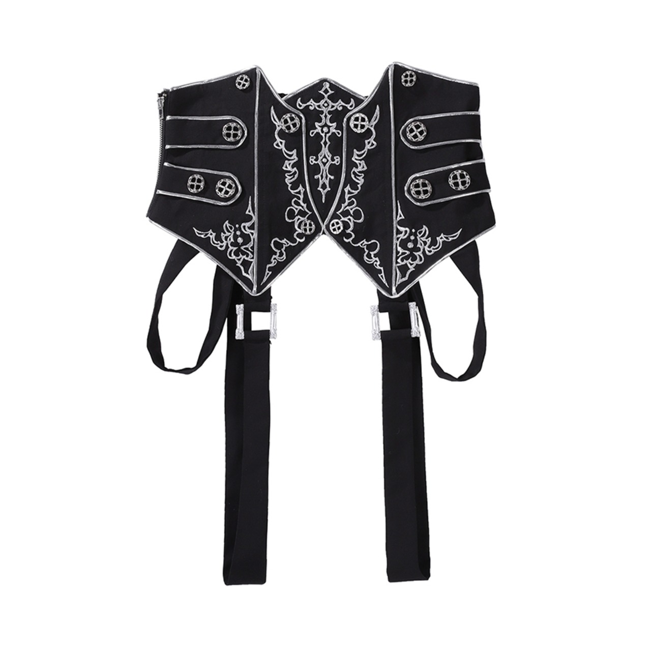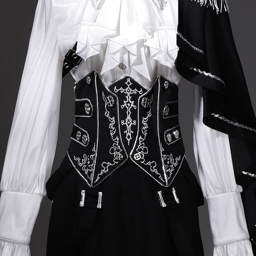 装飾コルセット: 銀の刺繍とボタンをあしらったボーン入りコルセットが、スタイルアップと高貴な雰囲気を叶えます。