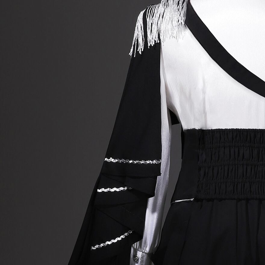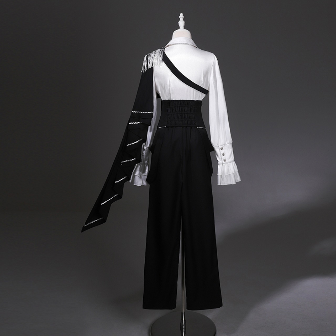 アシンメトリーなマント: 片側のみに配置されたロングマントが、動くたびにドラマチックなシルエットを描きます。