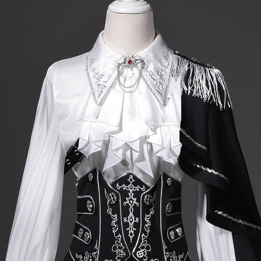 華やかなディテール: 襟元の刺繍、贅沢なジャボフリル、肩のフリンジが、中世貴族のような重厚感を与えます。