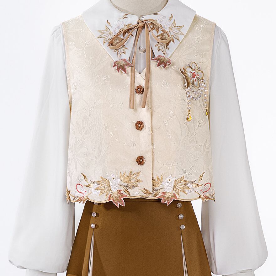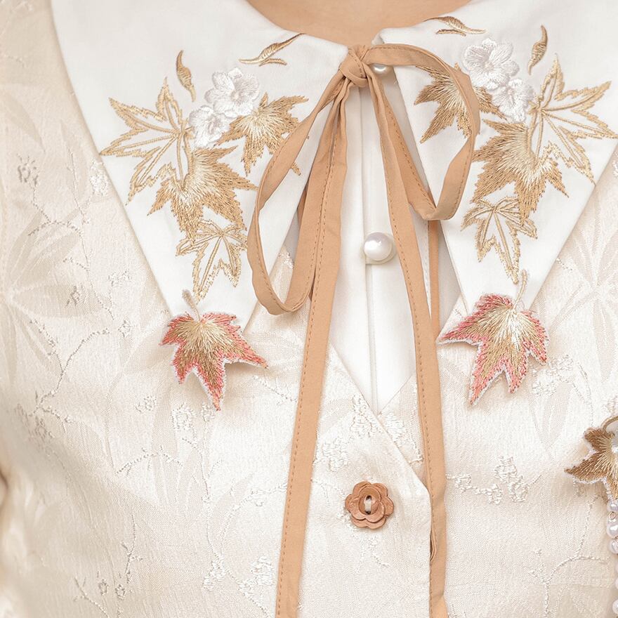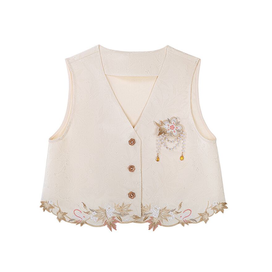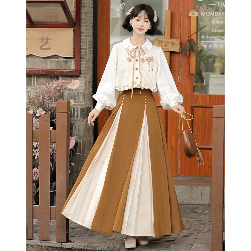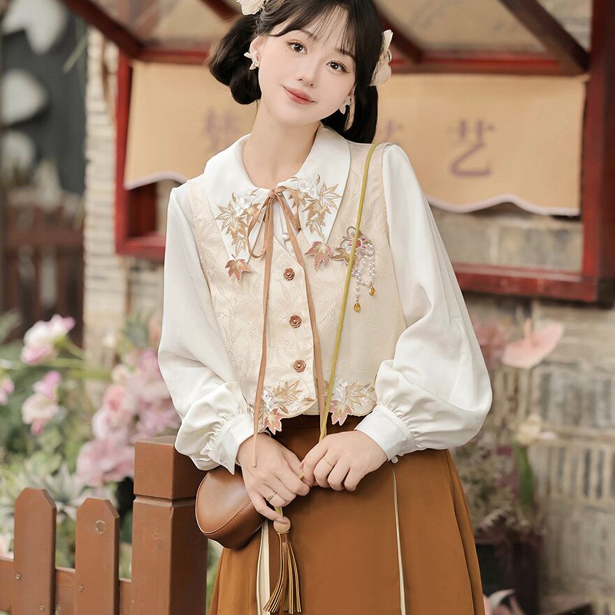 メープル刺繍のモダン漢服3点セット|刺繍ブラウス・ジャガードベスト・馬面裙風プリーツロングスカート