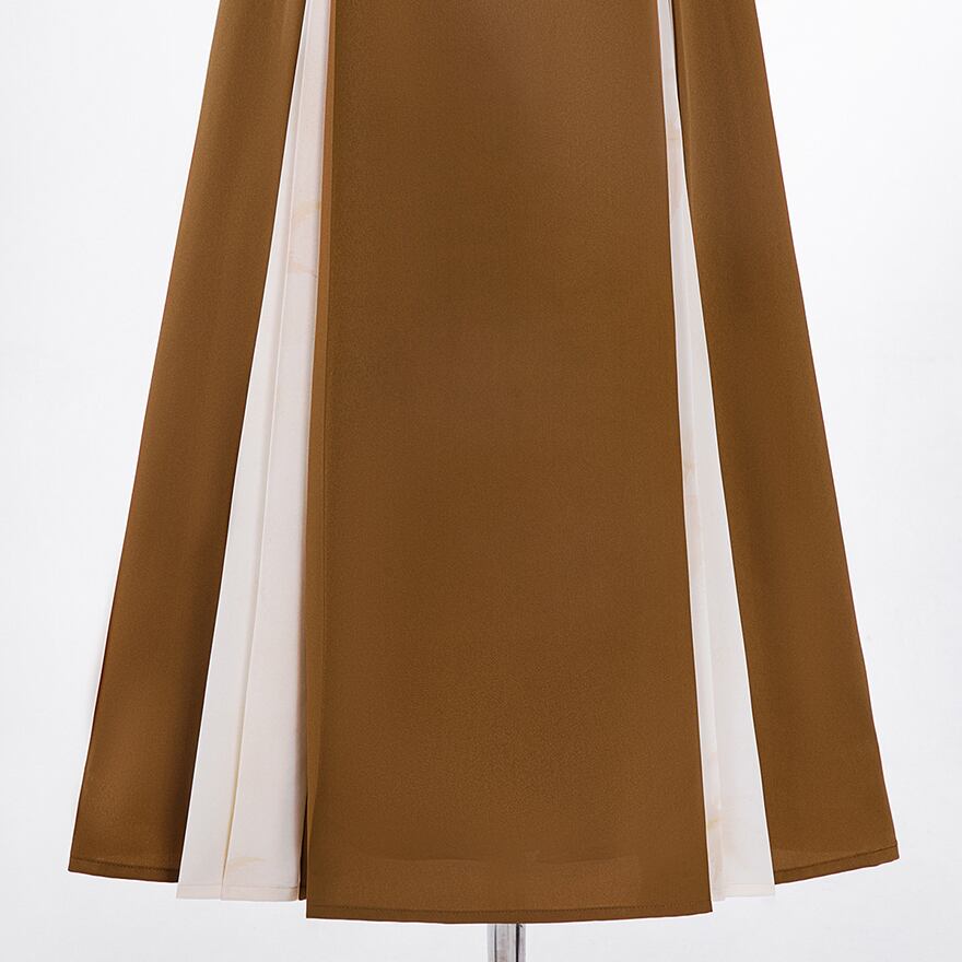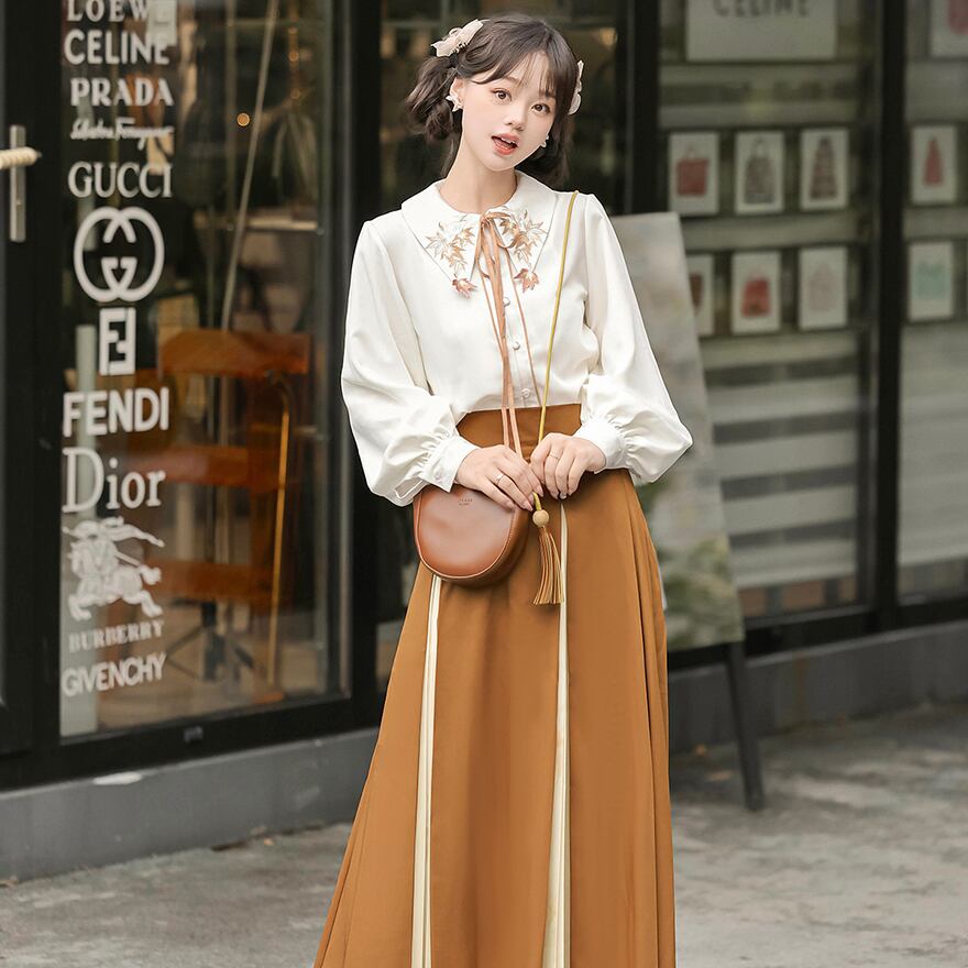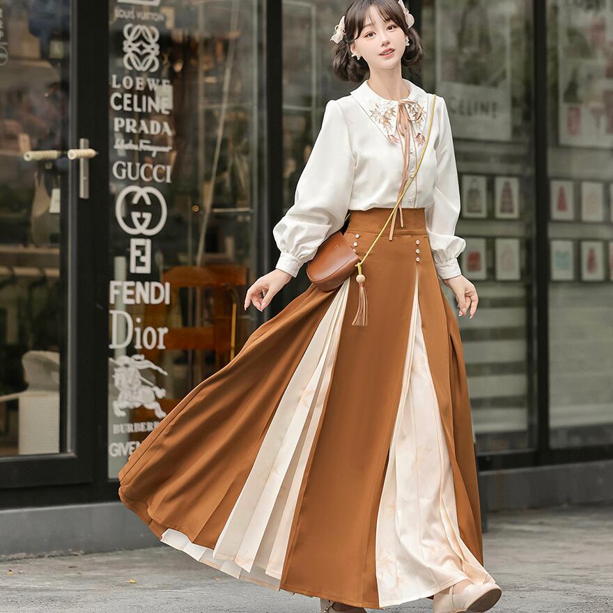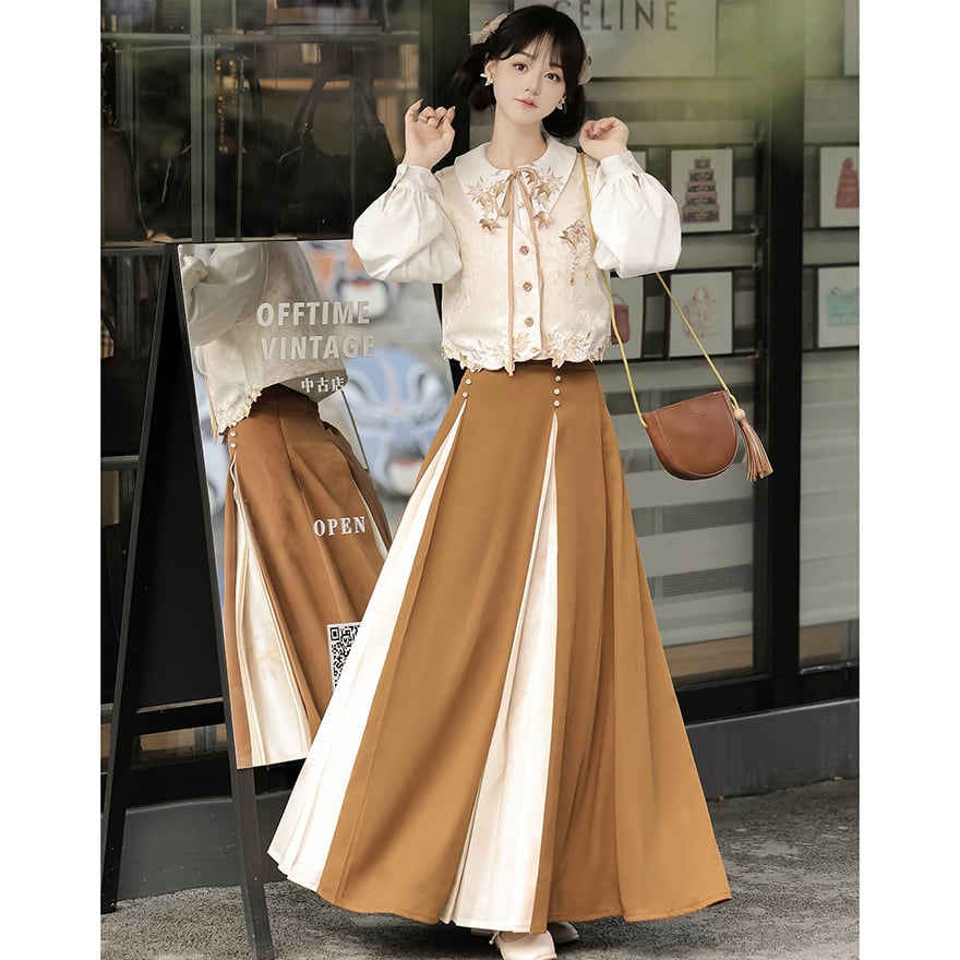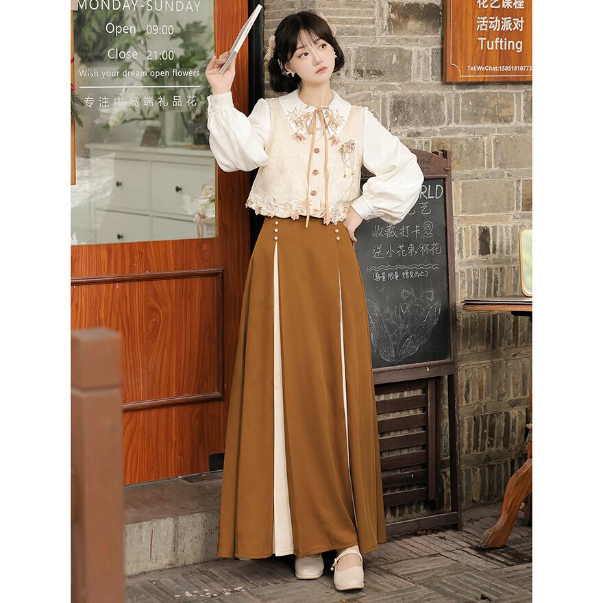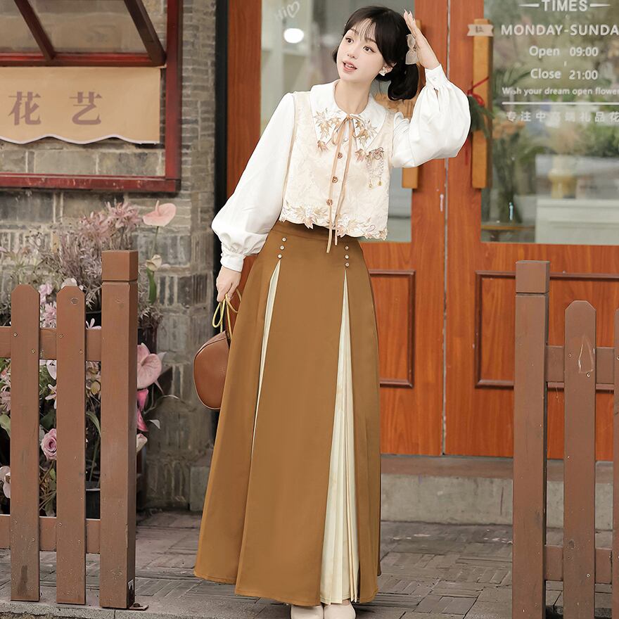 メープル刺繍のモダン漢服3点セット|刺繍ブラウス・ジャガードベスト・馬面裙風プリーツロングスカート