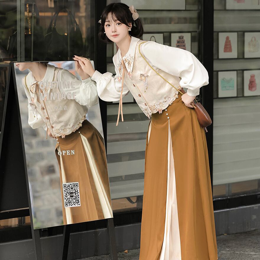 ボリューム袖のブラウス、繊細なジャガード織りのベスト、そして歩くたびに内側の柄が覗く馬面裙(マミェンチュン)風スカートが、上品でクラシカルな装いを演出。伝統的な美しさと現代のトレンドが融合した、特別な一着です。