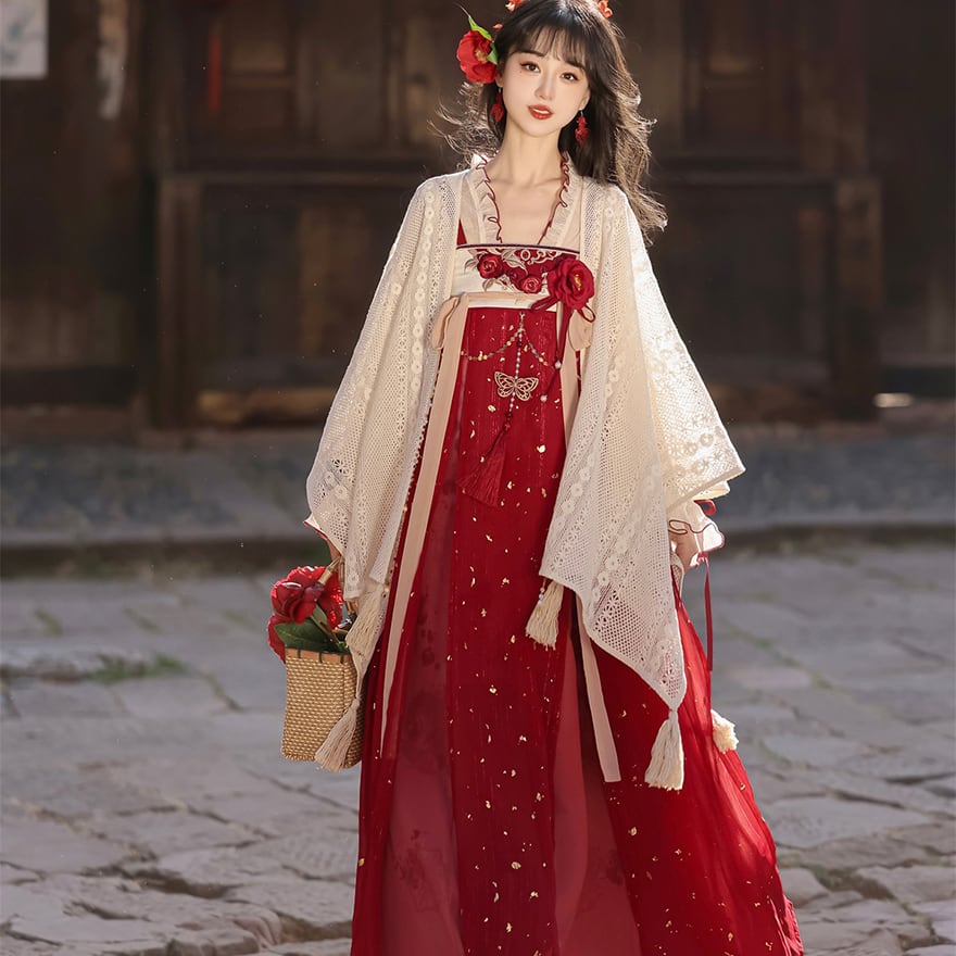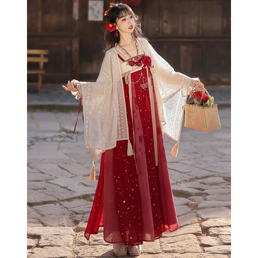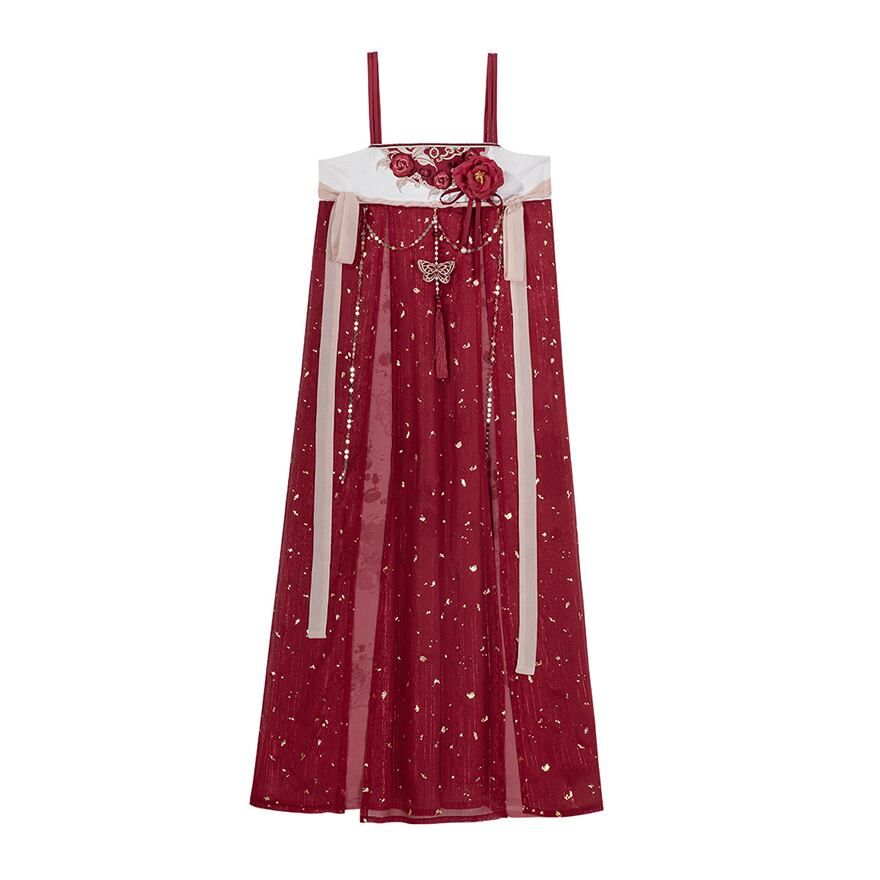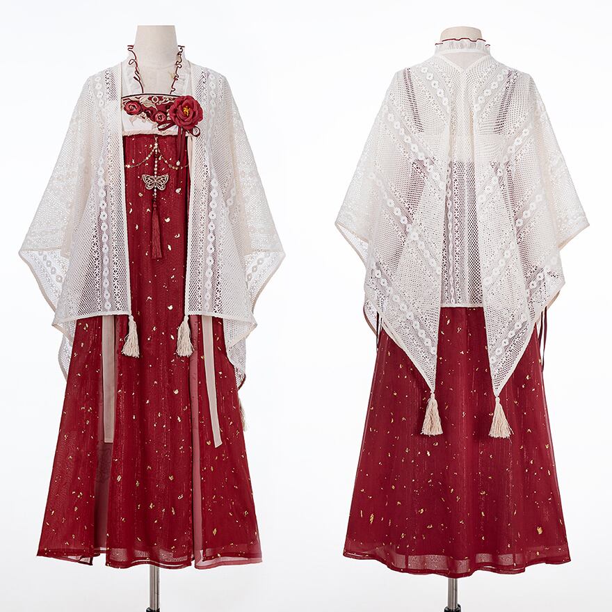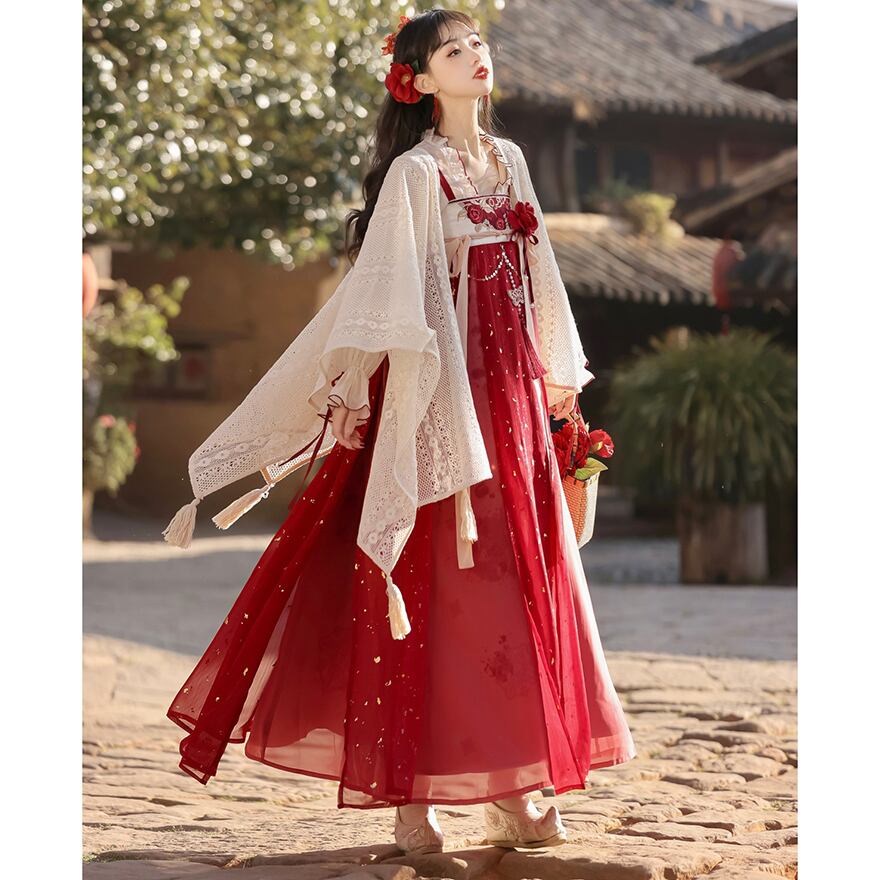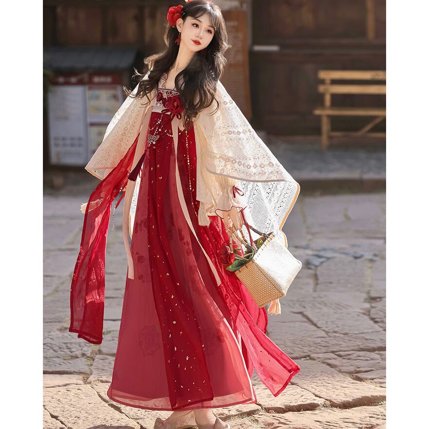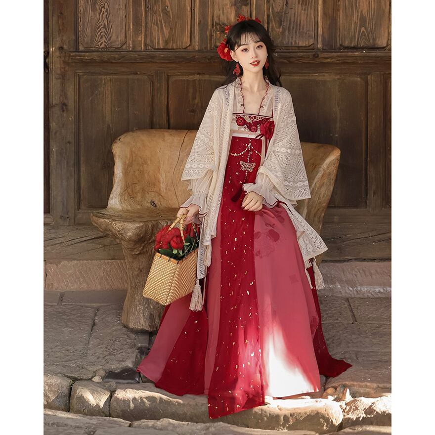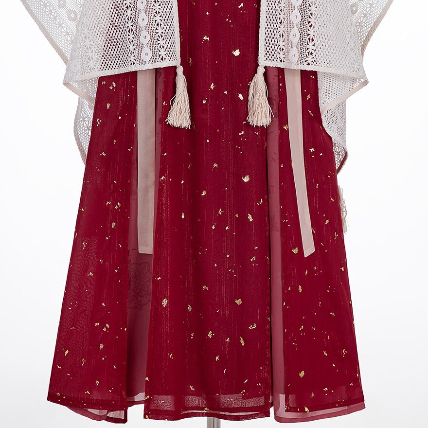 金箔舞う華やか漢服セット|紅色の刺繍キャミソールワンピース・透け感ブラウス・贅沢レースボレロ