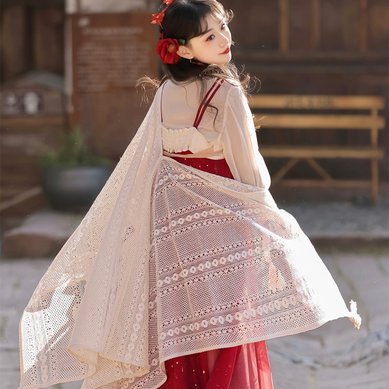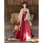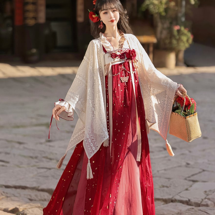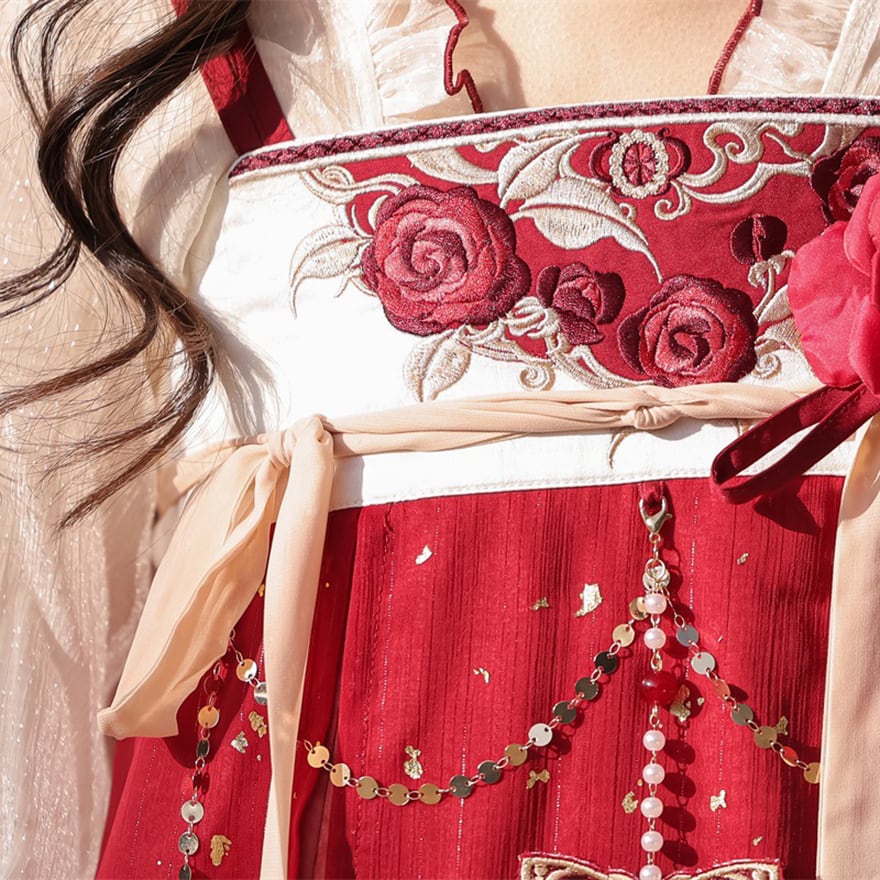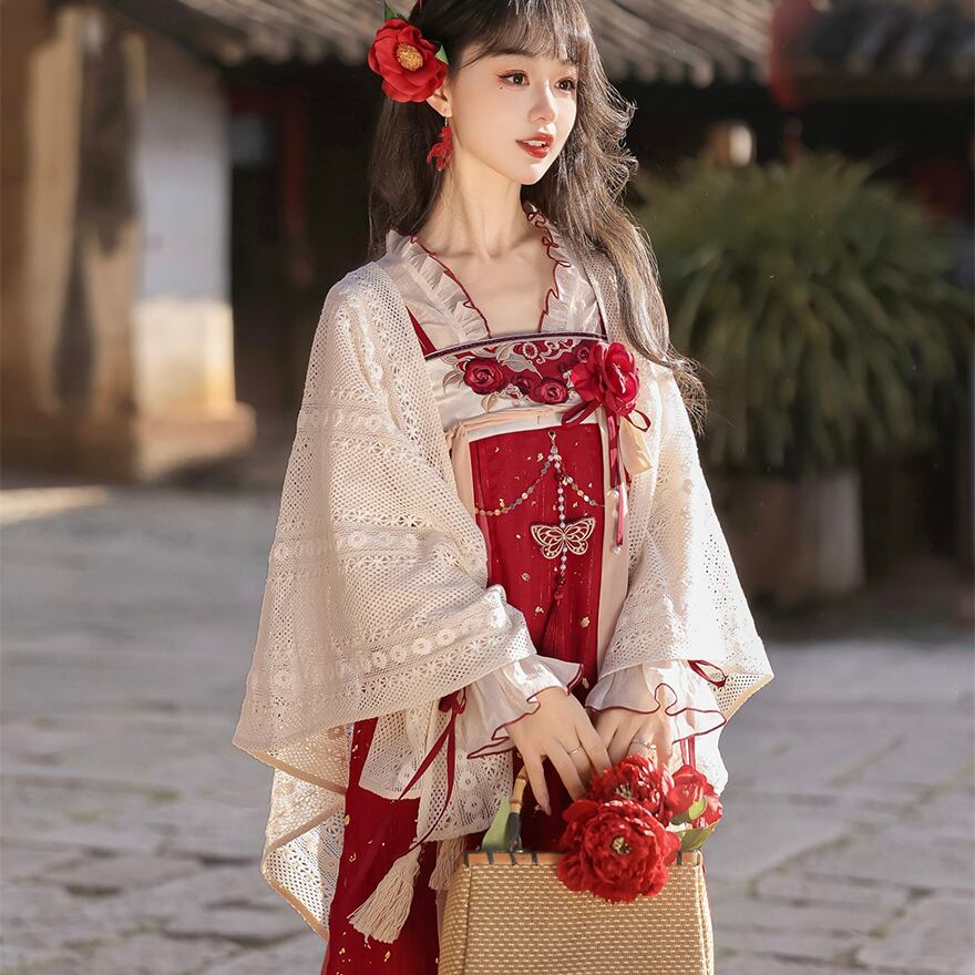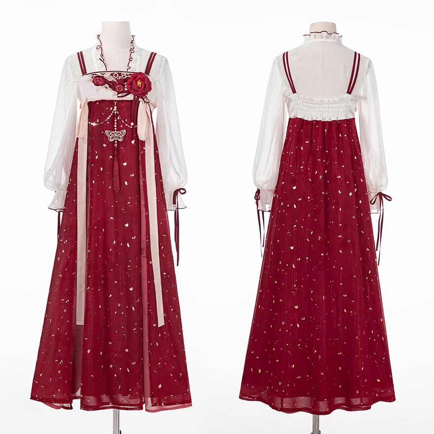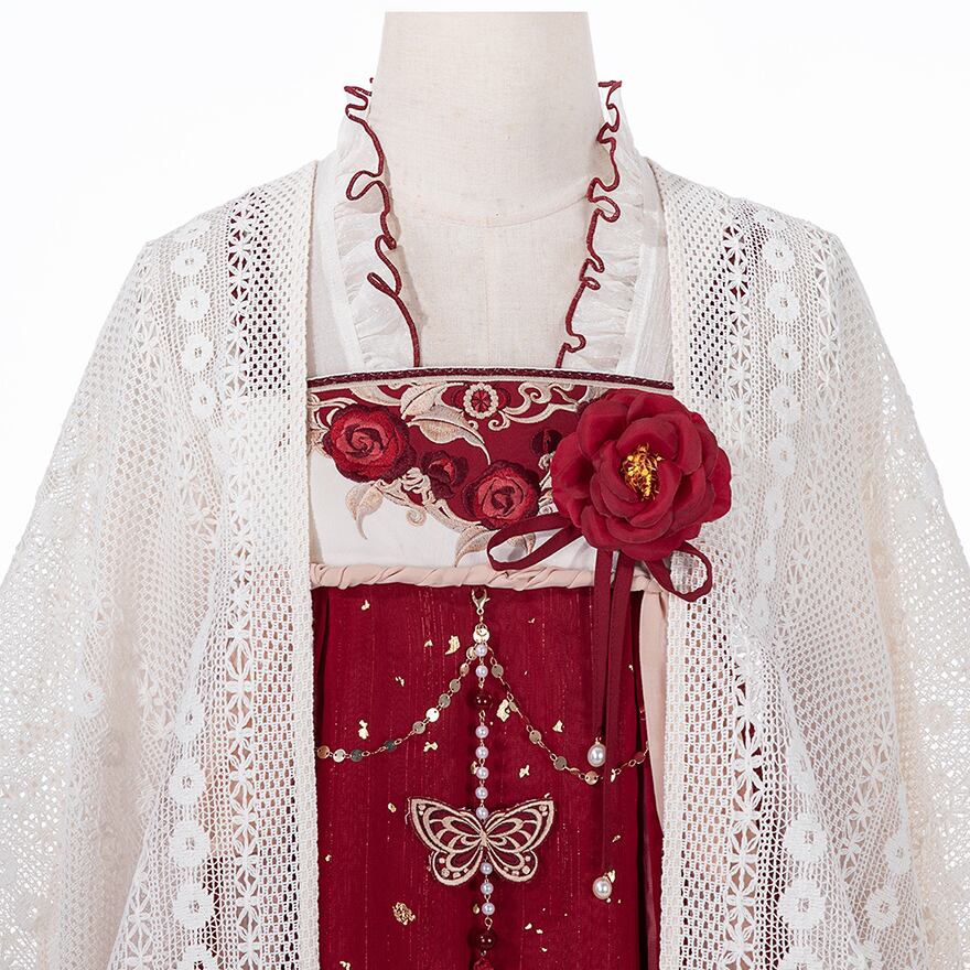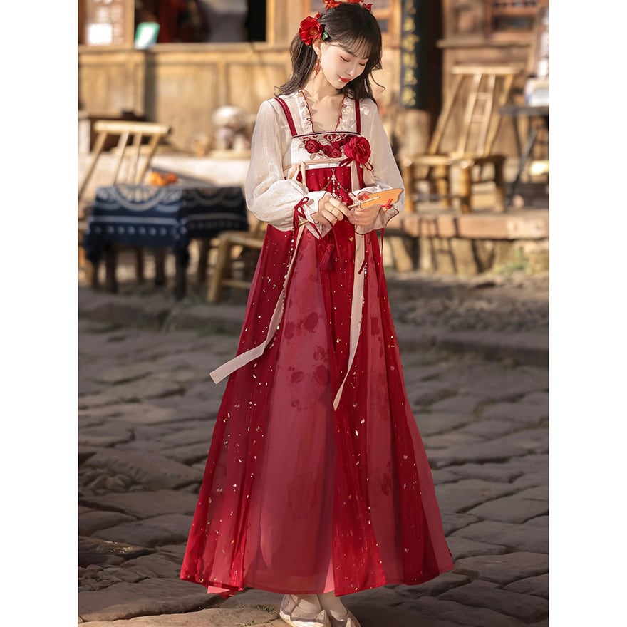 金箔舞う華やか漢服セット|紅色の刺繍キャミソールワンピース・透け感ブラウス・贅沢レースボレロ