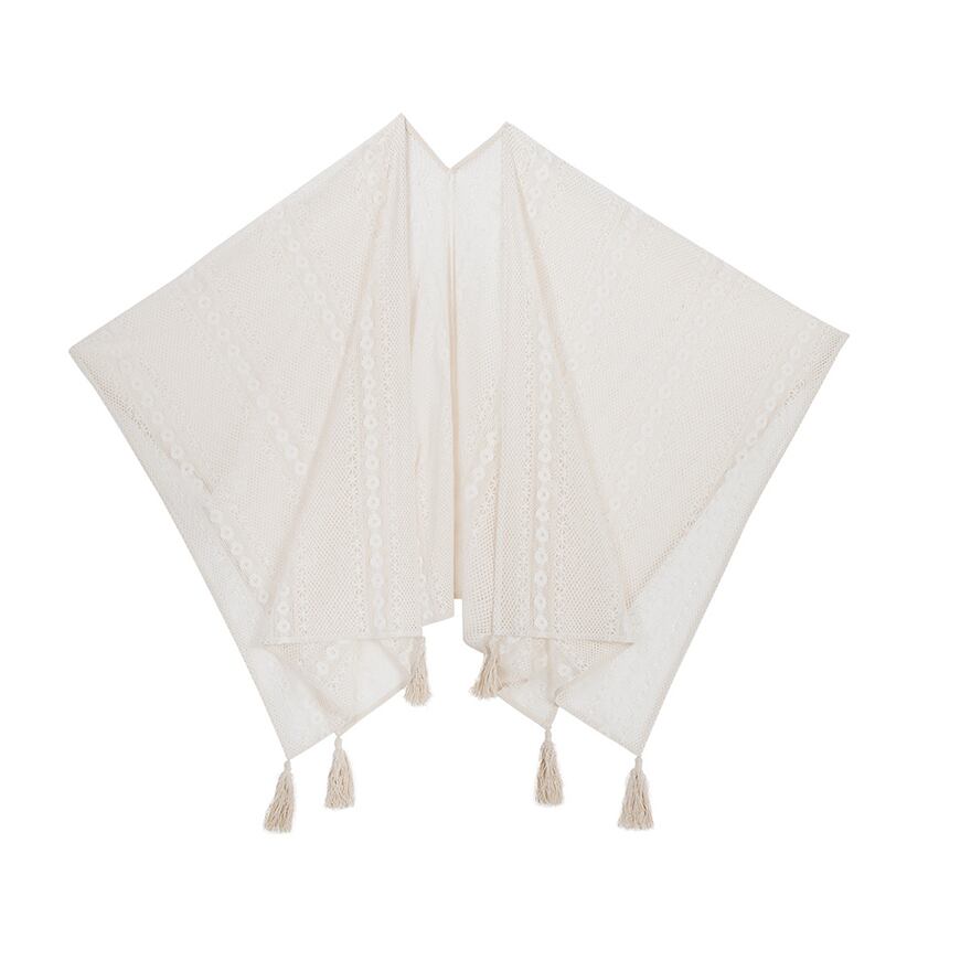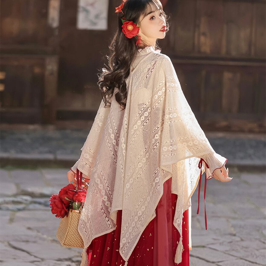 シアーなブラウスと、タッセル付きの優雅なレースボレロを重ねることで、奥行きのある上品な装いが完成します。