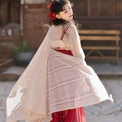 鮮やかな紅色に金箔のような散らし模様が輝く、幻想的な漢服風セットアップです。