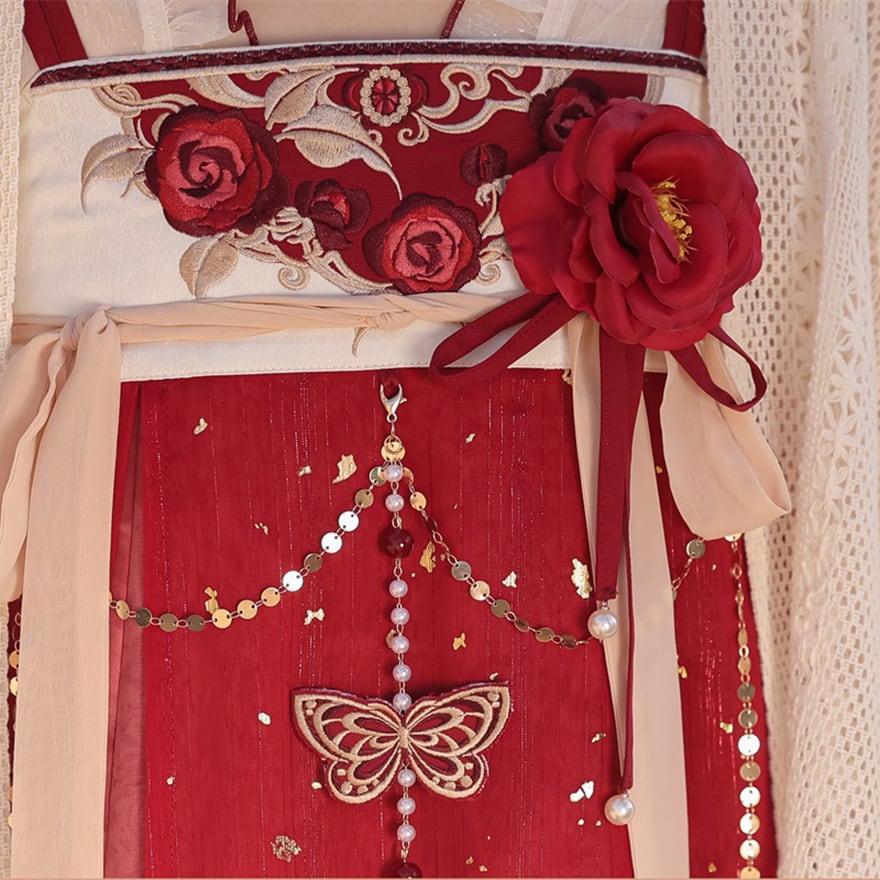 胸元を彩る大輪の花と繊細な刺繍、さらに蝶のチャームが華やかさを添えます。