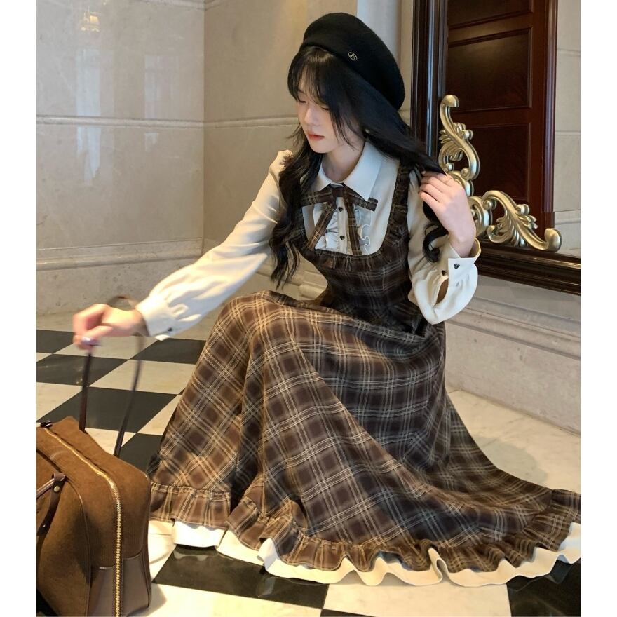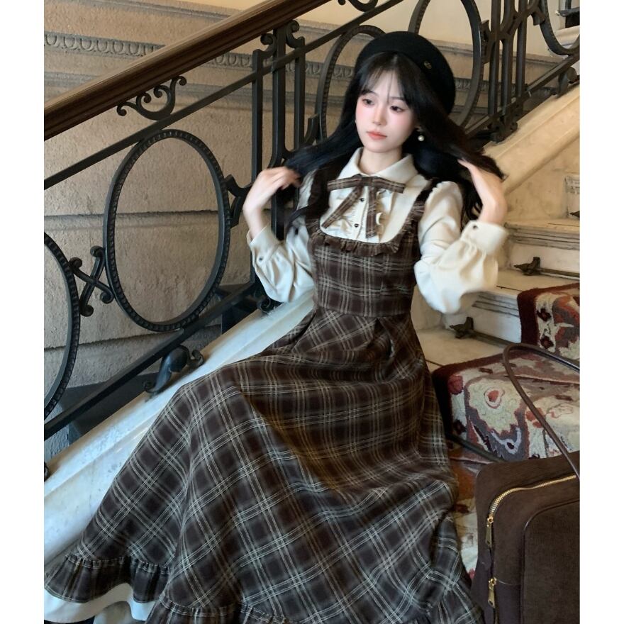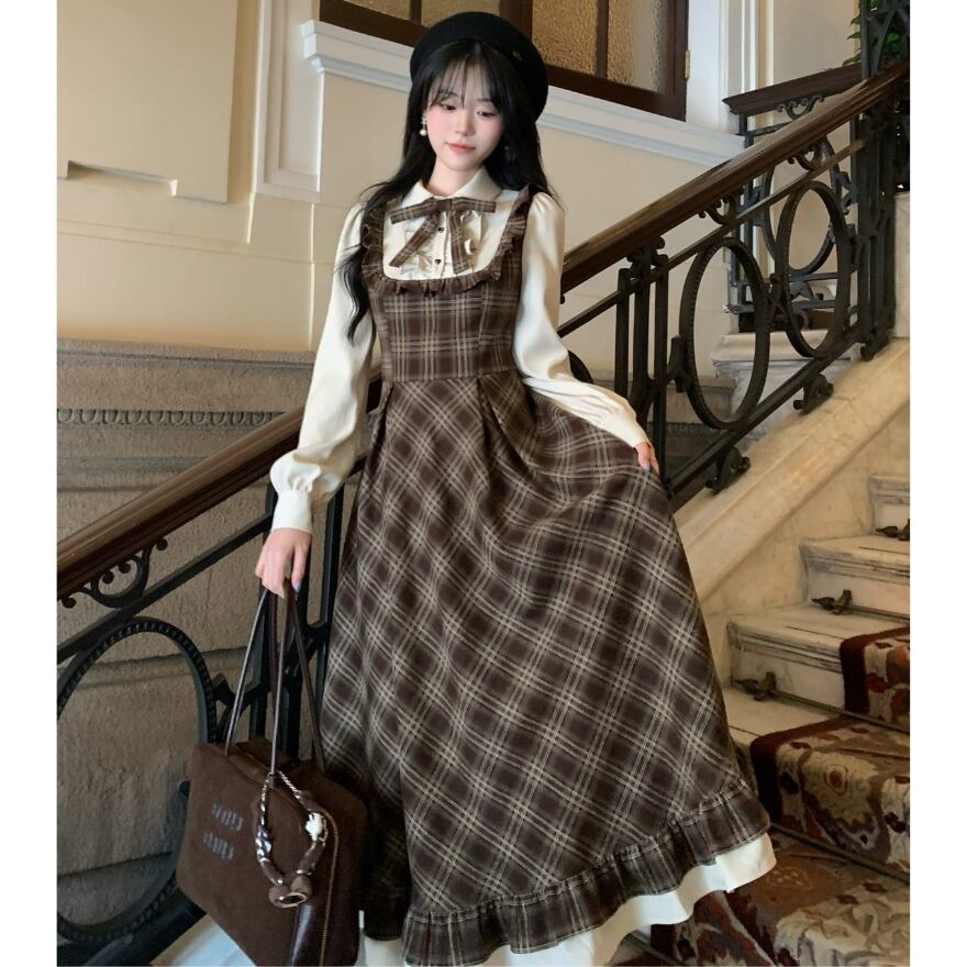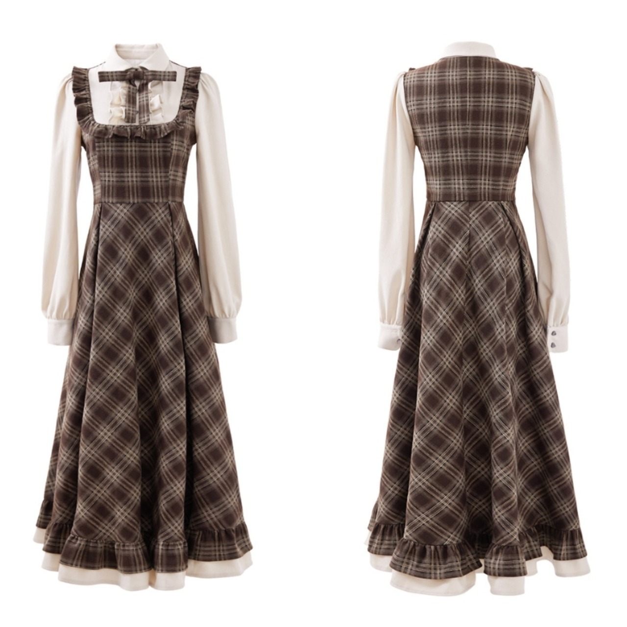 ロリィタファッションが初めての方にも取り入れやすい、落ち着いたブラウン系チェック柄のクラシカルロリィタワンピースです。白襟と長袖ブラウス風デザインが清楚な印象を与え、甘さを控えめにまとめた一着。派手すぎず、日常のお出かけや写真撮影にもなじむため、ロリィタデビューにも安心してお選びいただけます。
