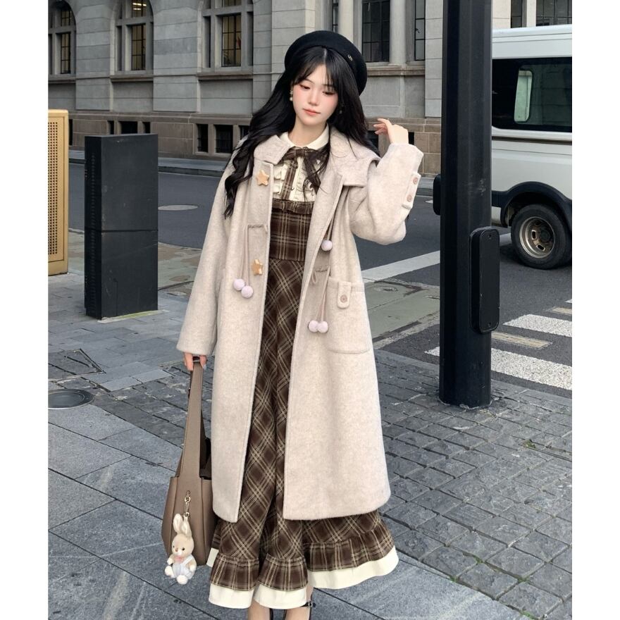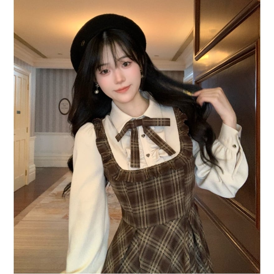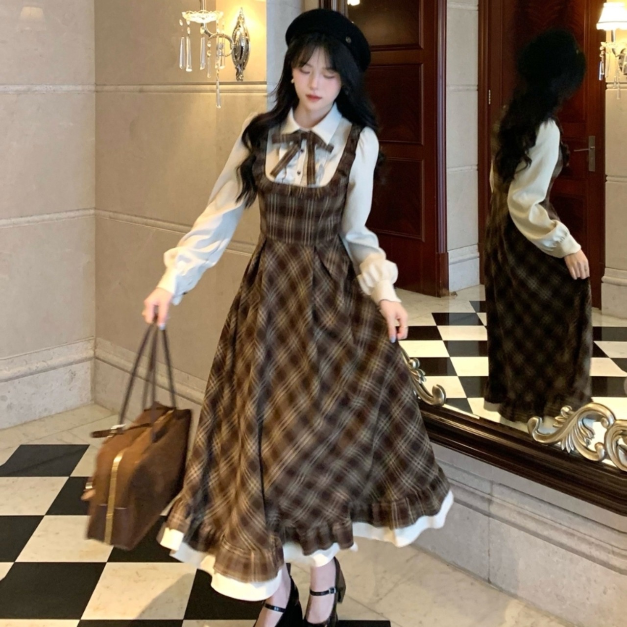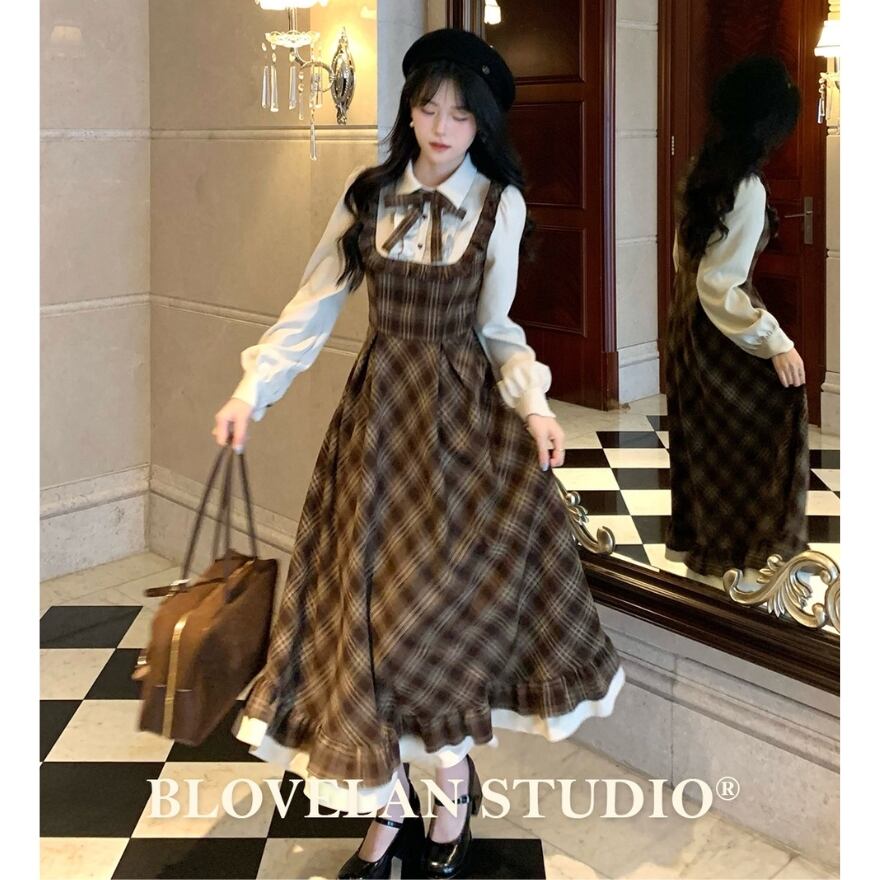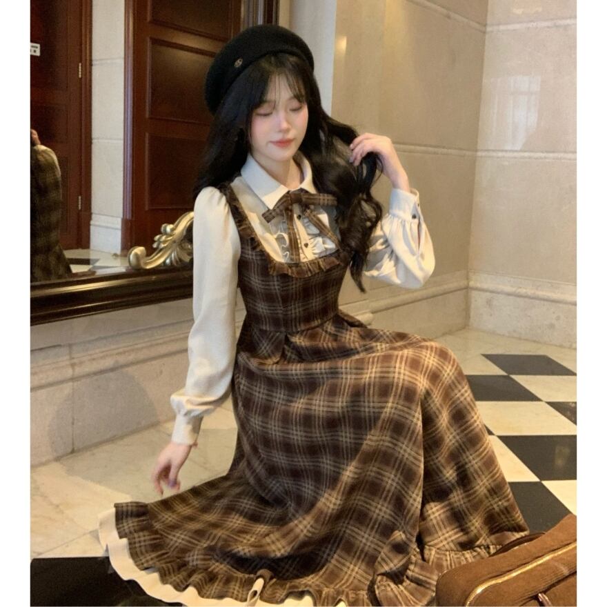 ロリィタファッションが初めての方にも取り入れやすい、落ち着いたブラウン系チェック柄のクラシカルロリィタワンピースです。白襟と長袖ブラウス風デザインが清楚な印象を与え、甘さを控えめにまとめた一着。派手すぎず、日常のお出かけや写真撮影にもなじむため、ロリィタデビューにも安心してお選びいただけます。