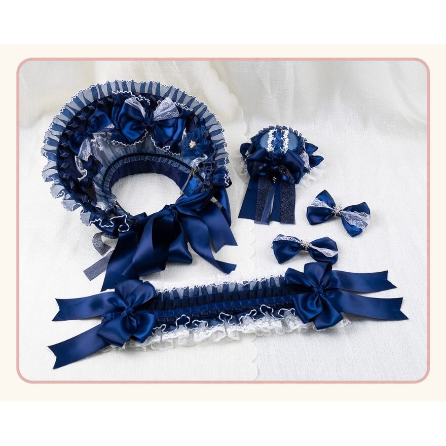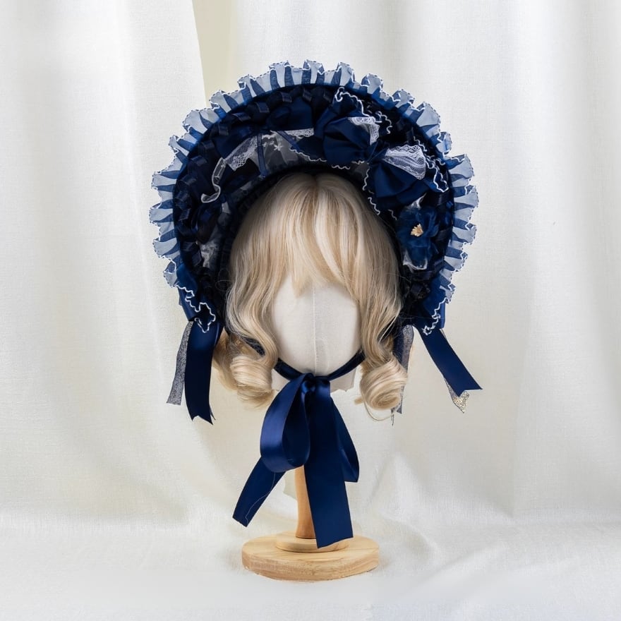 ロリィタファッションが初めての方でも取り入れやすい、ネイビーカラーを基調としたクラシカルなボンネットです。