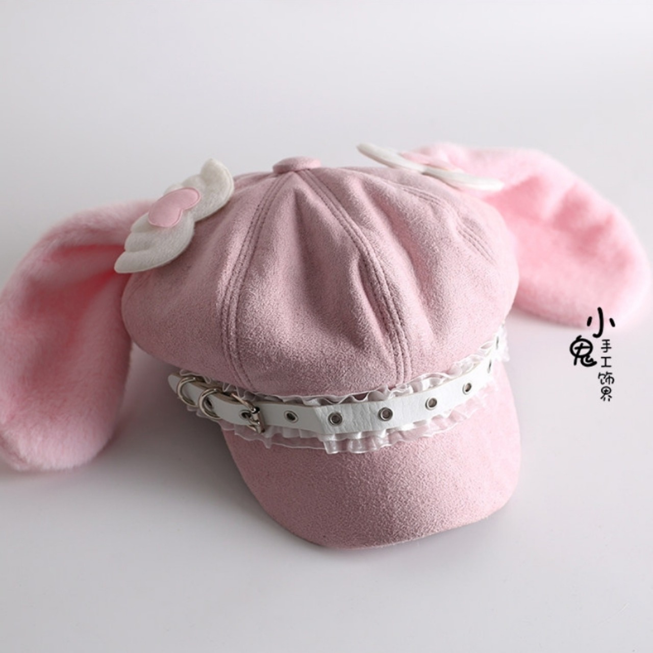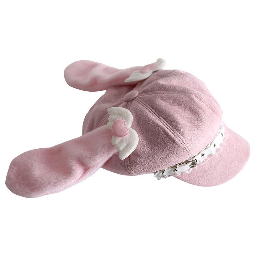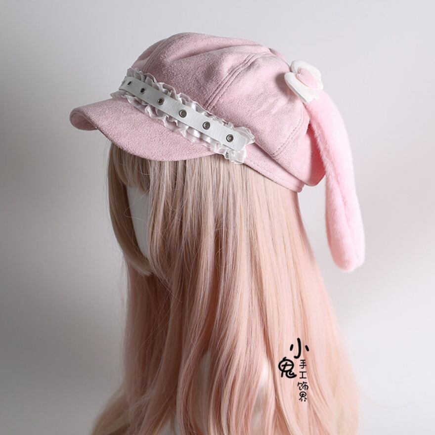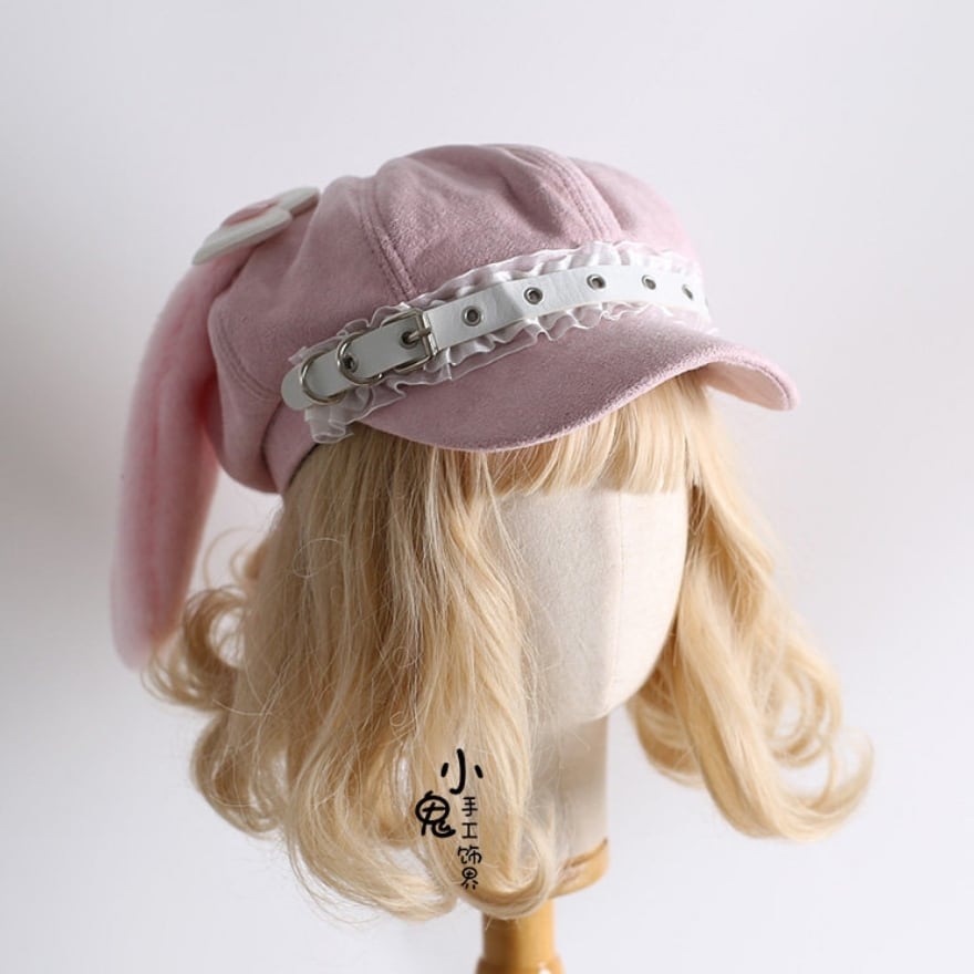 ふんわりとした起毛素材に、垂れたうさ耳モチーフとハート装飾を組み合わせた、甘さたっぷりのキャスケット風八角帽です。