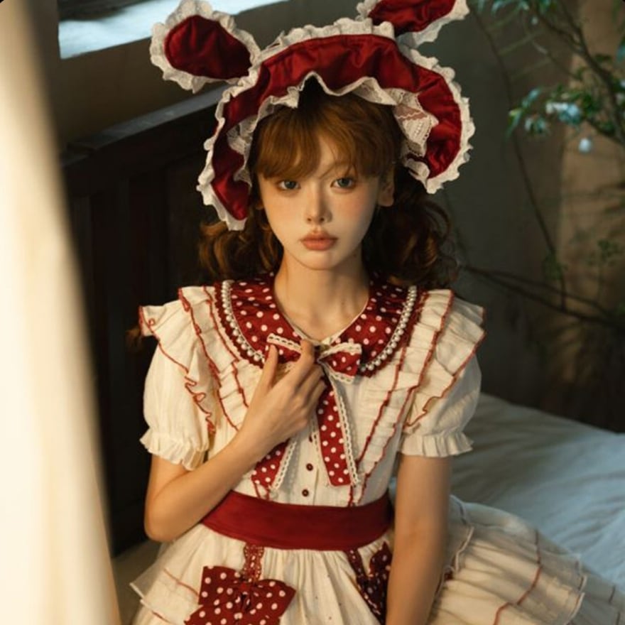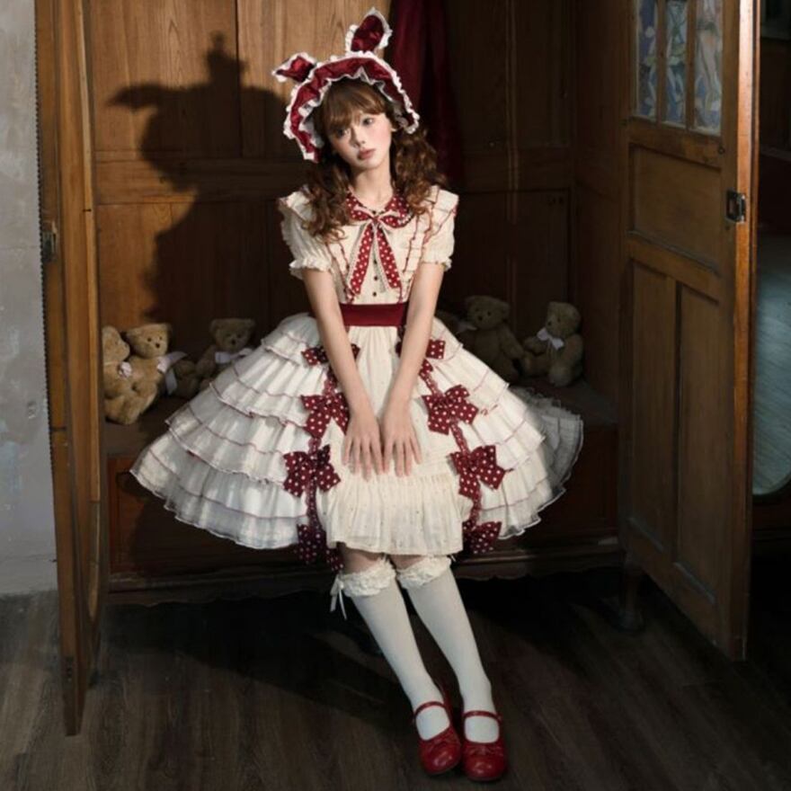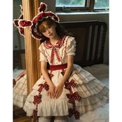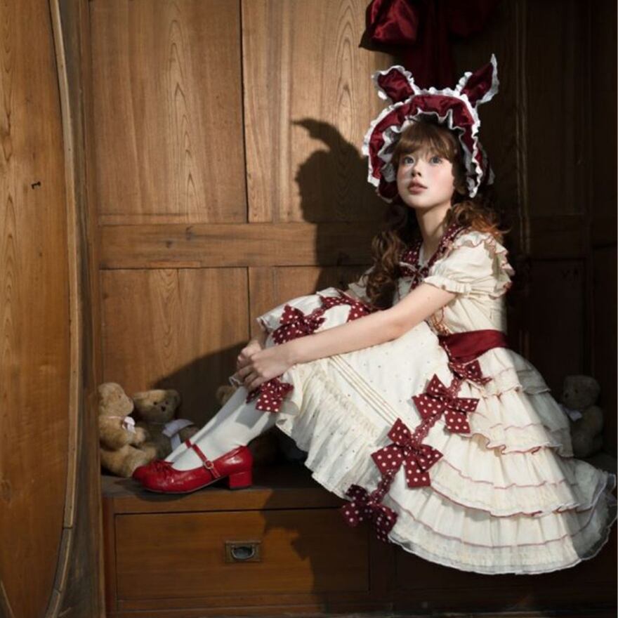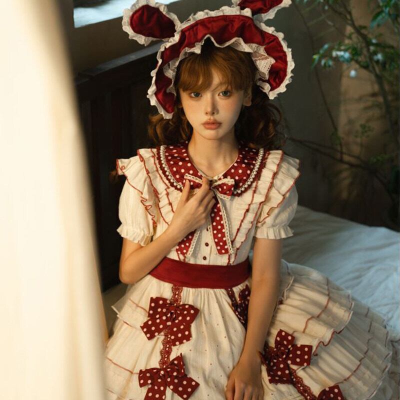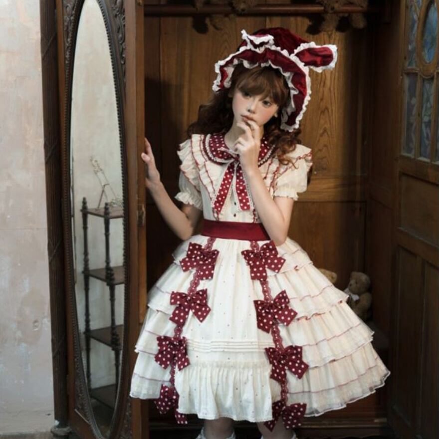 やさしい生成りカラーに深みのあるボルドーリボンが映える、甘さと上品さを併せ持ったロリィタワンピースです。