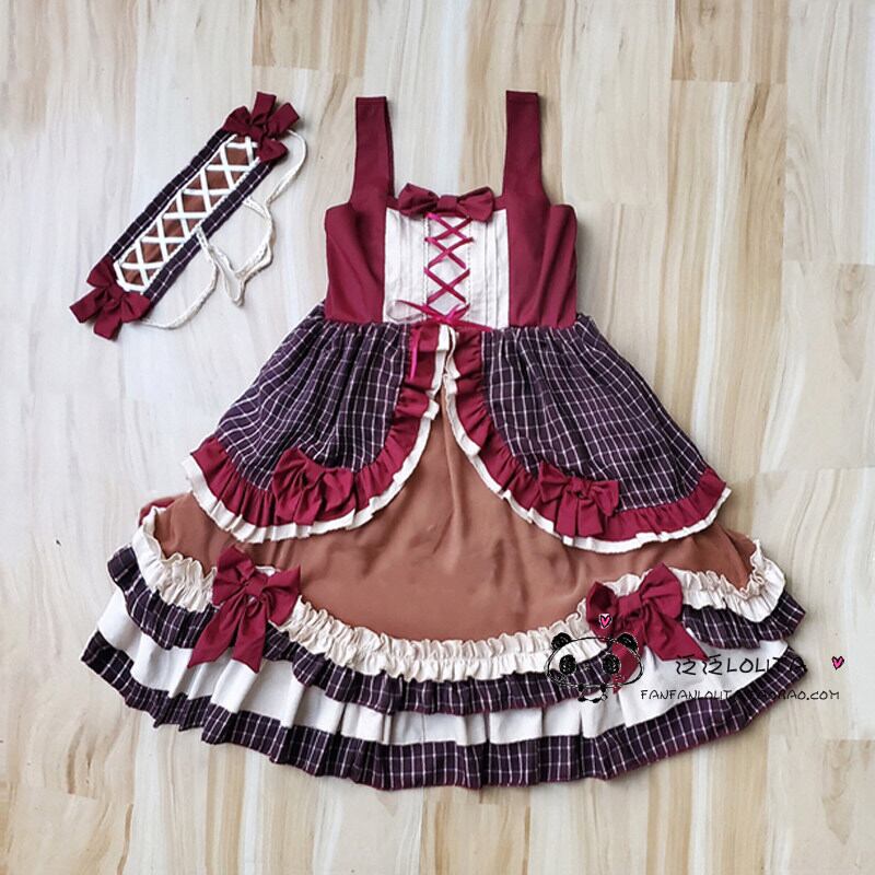 深みのあるボルドーカラーとチェック柄が印象的な、クラシカルな甘ロリジャンパースカートです。