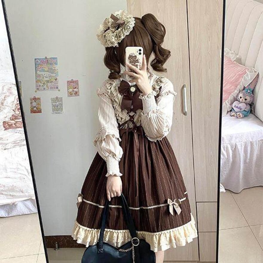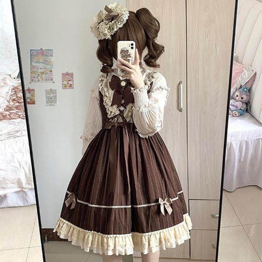 深みのあるブラウンを基調に、生成りフリルとリボンが映えるクラシカル甘ロリのジャンパースカートです。広がりすぎないシルエットで、初めての方でも取り入れやすい落ち着いた印象。甘さと上品さのバランスがよく、ロリィタデビューの不安にやさしく寄り添う一着です。