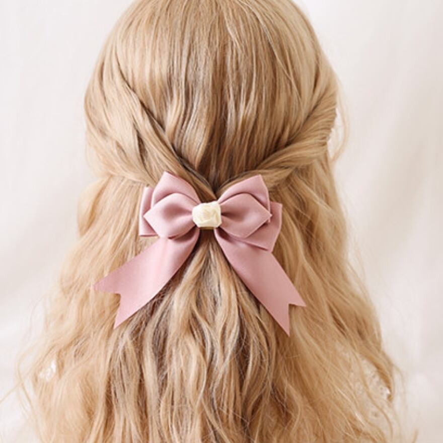 柔らかなピンクリボンが上品な甘さを演出し、ヘアアクセサリーとしてはもちろん、胸元やバッグに添えても華やかさをプラスできます。