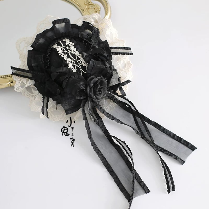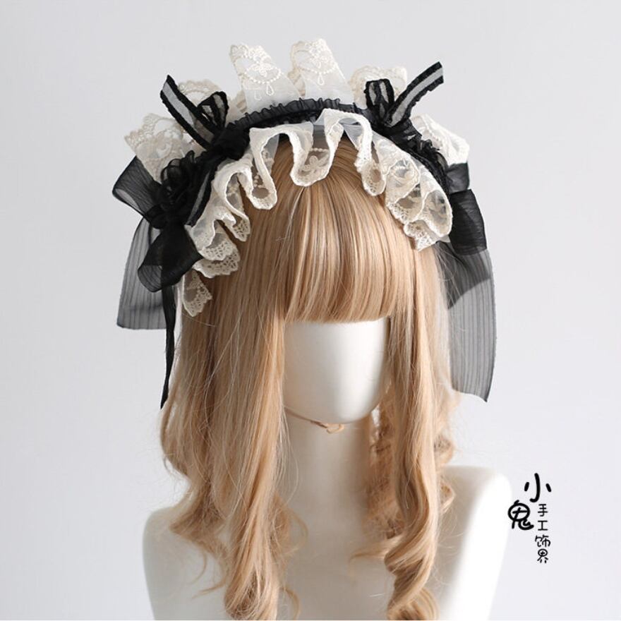 繊細なホワイトレースにブラックのオーガンジーリボンを重ねた、クラシカルな印象のロリィタ向けヘッドドレスです。