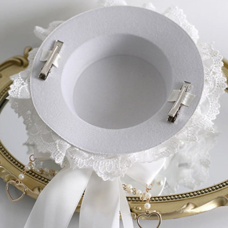 花びらを重ねた立体的なフラワーモチーフと、細く流れるリボンが印象的なヘアアクセサリー。清楚でやわらかな雰囲気が、甘ロリやクラシカルロリィタの装いに自然に溶け込みます。
