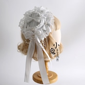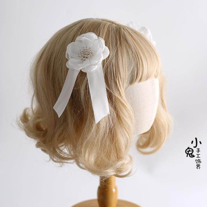やさしいホワイトカラーのフラワーモチーフに、揺れるリボンを添えたロリィタ向けヘアアクセサリーです。