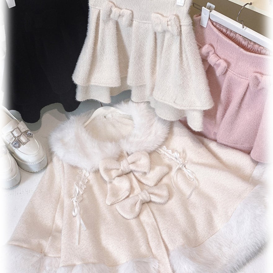 ふわふわのファーとリボンが目を引く、やさしい雰囲気のケープアウター。