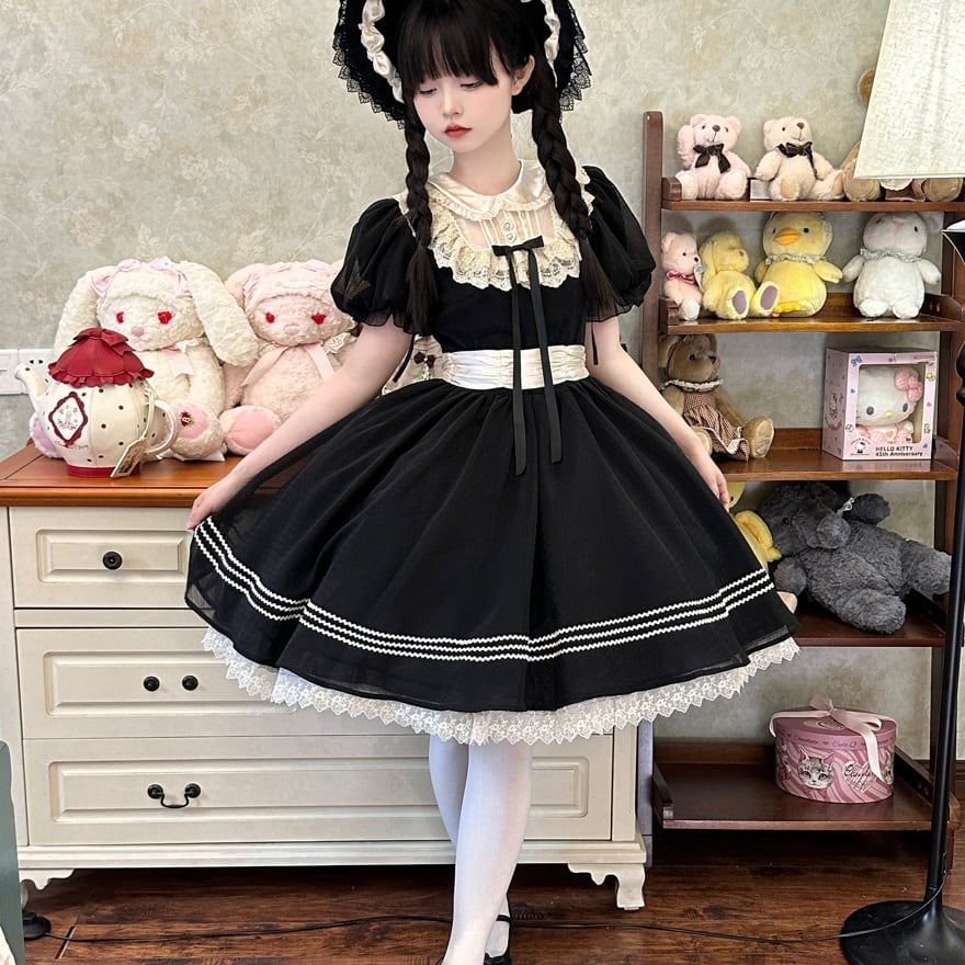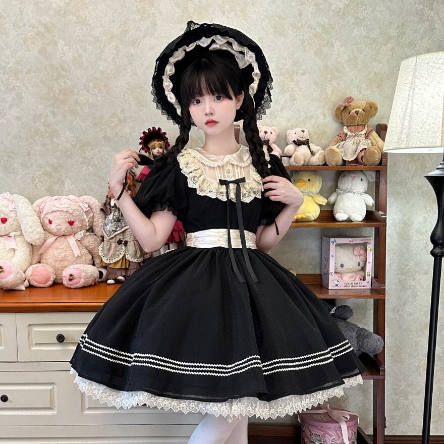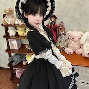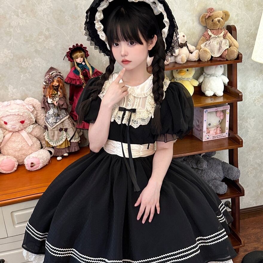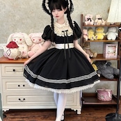 ふんわり広がるシルエットと、上品な黒×生成レースが印象的なゴスロリワンピース。付け袖タイプのため動きやすく、重たく見えにくいのが特徴です。着るだけで世界観が完成し、はじめてでも安心してゴスロリの雰囲気を楽しめます。お出かけや撮影会にもおすすめです。