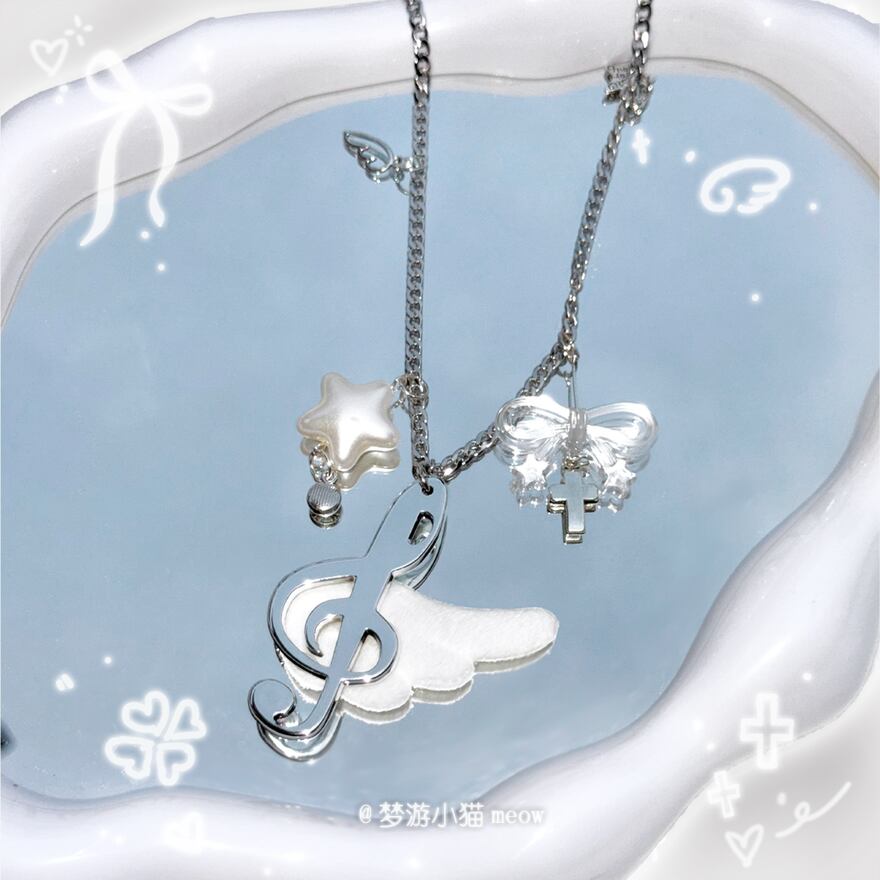 音符にそっと天使の羽を添えた、やさしい雰囲気のホワイトヘアクリップです。光を受けてほのかに輝くデザインは、甘ロリやゆめかわコーデに自然になじみ、初心者の方でも取り入れやすい仕上がり。髪に留めるだけで世界観が完成し、すぐに着けたくなる安心感があります。