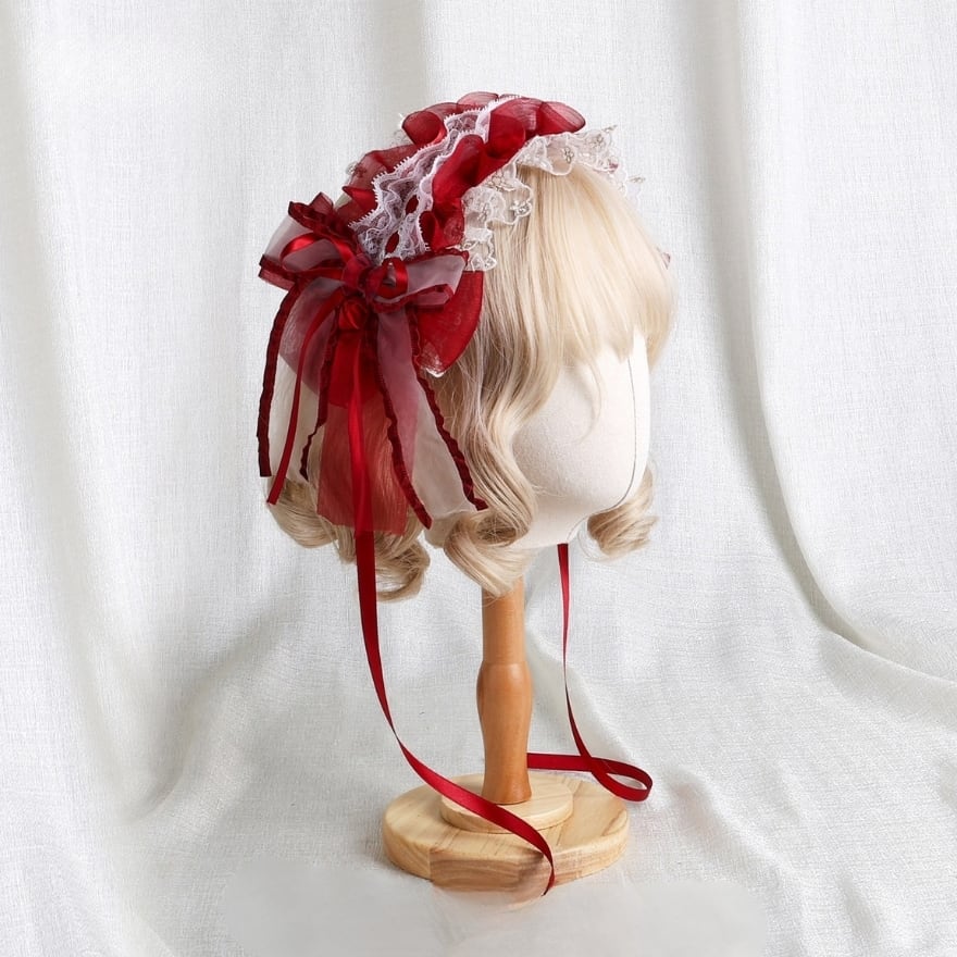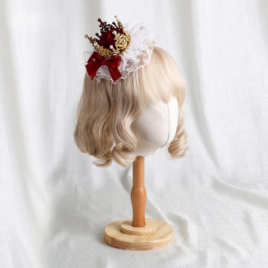 ロリィタコーデにそっと華やぎを添える、薔薇モチーフと赤リボンが印象的な小帽子です。