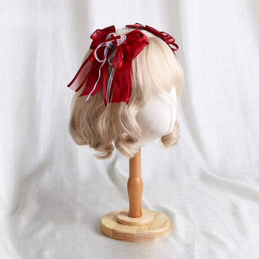 透け感のある赤い大きなリボンと白レースを重ねた、ロリィタらしい存在感のあるヘアドレスです。